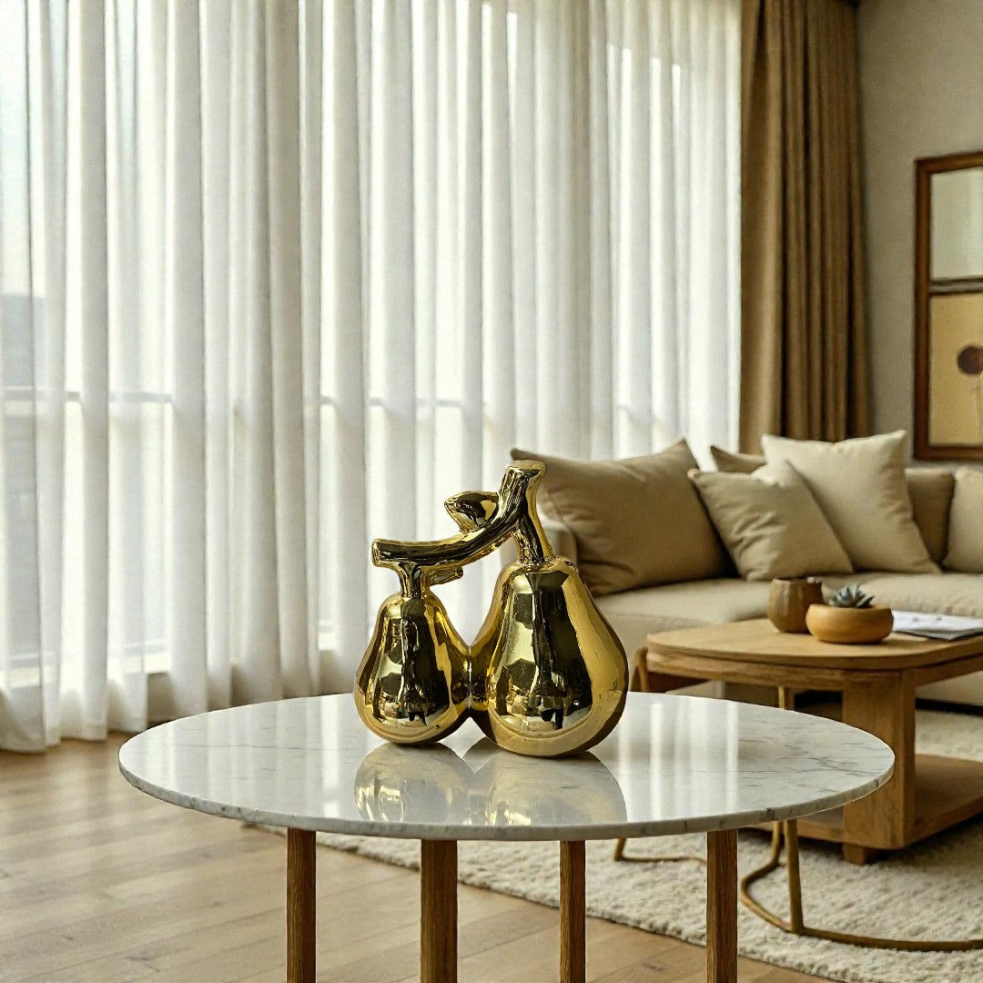 The Golden Orchard Ceramic set brings a touch of refined elegance and modern charm to any space. Each pear-shaped figure is crafted with smooth, reflective surfaces that capture light and attention, adding warmth and sophistication. Perfect as a centerpiece, decorative accent, or thoughtful gift, this collection celebrates simplicity, luxury, and the timeless beauty of nature reimagined in artful ceramic form.