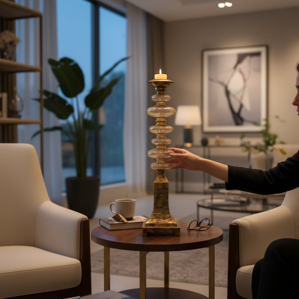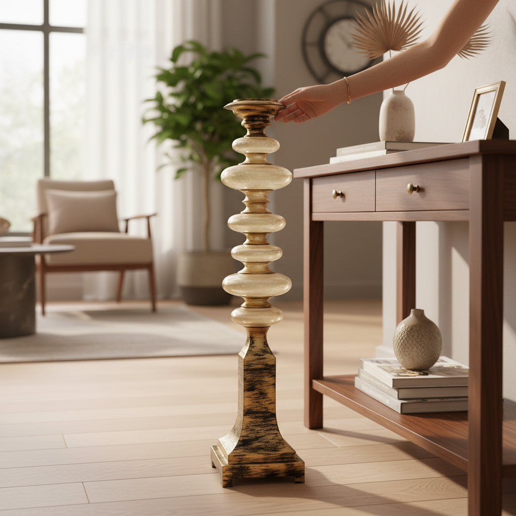 The Regal Pillar Gold Floor Candle Stand is a majestic décor piece designed to bring height, elegance, and sophistication to any space. Featuring a beautifully sculpted vertical structure with a luxurious gold finish, this stand creates a striking focal point in living rooms, event spaces, or grand entryways. Perfect for pillar candles, it enhances ambiance with timeless charm and modern refinement.