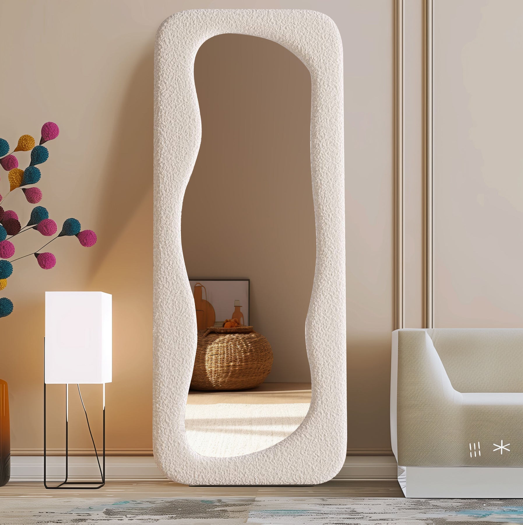 Framed in a smooth, neutral-toned finish, Solara blends seamlessly with earthy palettes, textured walls, and soft furnishings. The full-length design offers a clear, practical reflection while the curved outline adds visual interest and gentle movement to your room. Whether placed in a bedroom, dressing area, living space, or entryway, it instantly enhances the atmosphere with a relaxed yet refined presence.