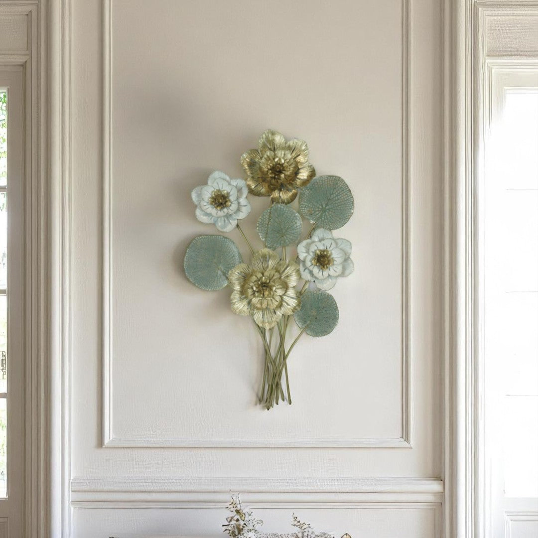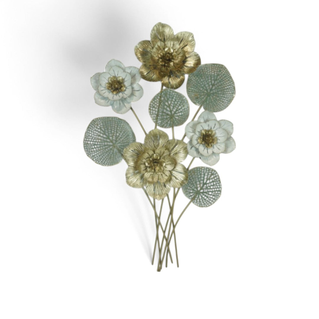 A beautifully crafted metal wall décor featuring a stunning bouquet of flowers in gold, white, and soft blue tones. The intricate floral design, combined with delicate leaf detailing, creates a graceful and sophisticated look. The metallic accents enhance its elegance, making it an ideal decorative piece for living rooms, bedrooms, hallways, or office spaces. This floral wall motif brings a refreshing and artistic touch to any interior, complementing both modern and classic décor styles