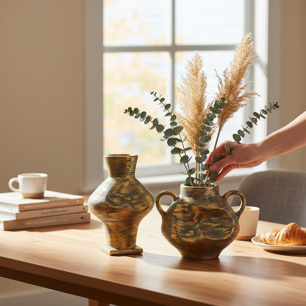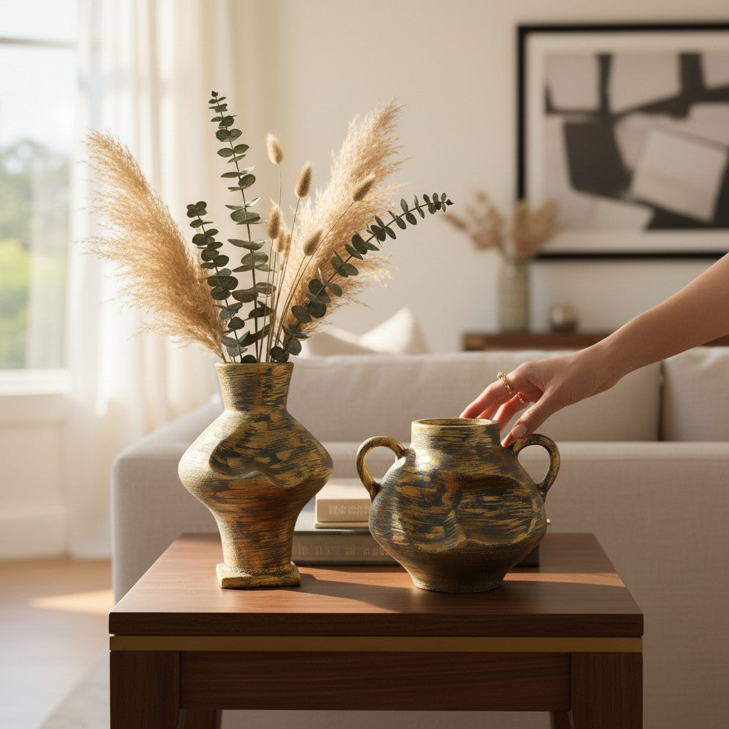 Crafted with refined precision, the Ebony Petal Symphony Vase showcases a clean matte-black body adorned with gentle carved lines that offer an understated elegance. Its tall, modern shape becomes the perfect stage for a trio of colorful gerbera flowers—each bloom presenting its own vivid personality. The white bloom brings purity, the orange adds warmth and energy, and the pink contributes a soft, cheerful charm. Together, they create a harmonious symphony of color rising from a quiet, minimalist base. This arrangement is ideal for modern interiors, where it adds depth, contrast, and artistic flair. Whether placed on the floor, a side table, or next to contemporary furniture, it transforms its surroundings into a scene of effortless style and visual delight.