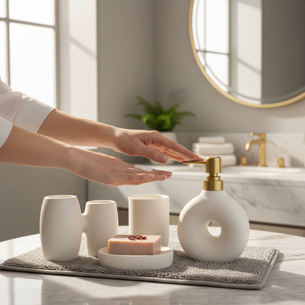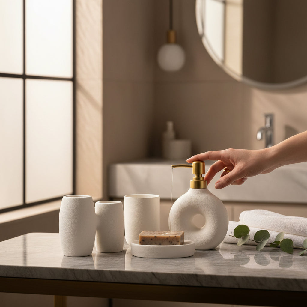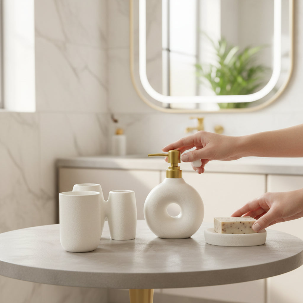 The Nova Luxe Bathroom Set blends modern aesthetics with practical design. Featuring a polished ceramic surface and clean lines, each piece is thoughtfully crafted to elevate your bathroom décor. Durable and easy to maintain, this 3-piece ceramic set adds a touch of sophistication while keeping essentials neatly organized.