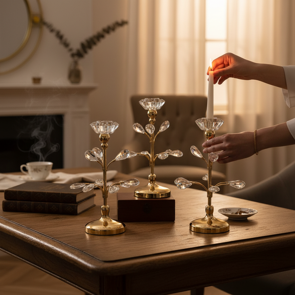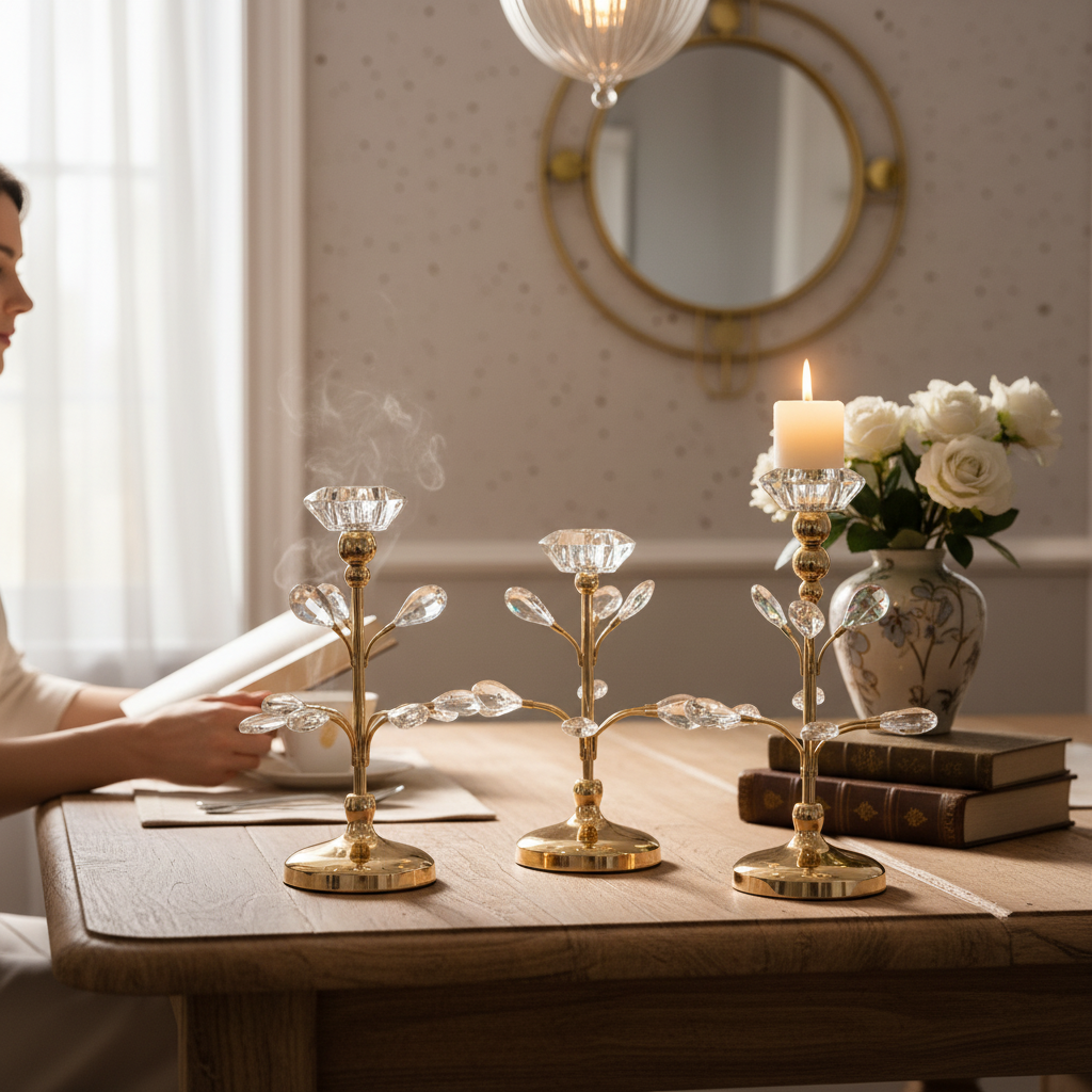 Celestial Glow Double Lotus Stand features a refined metallic body and brilliant crystal accents that sparkle under candlelight. The twin candle holders create a symmetrical and luxurious look, ideal for weddings, celebrations, and spiritual décor.
