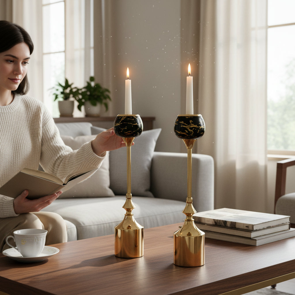 Crafted with the artistry of a bygone era, the Metallic Heritage Candle Stand features an ornate metal base with vintage finishing, enhanced by hand-set crystals that sparkle with subtle brilliance. Ideal for classical interiors or event décor, this piece delivers both visual impact and timeless appeal. Whether gracing a wedding table or adding charm to a quiet corner of your home, it offers a rich blend of tradition, luxury, and atmospheric lighting.