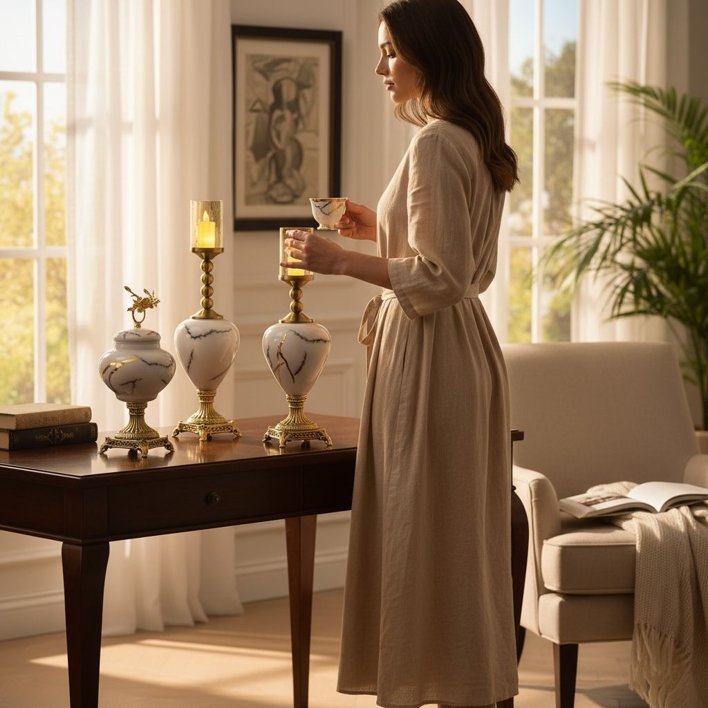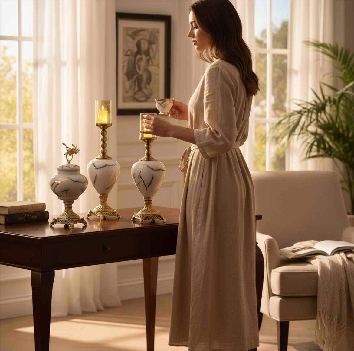 A luxurious decorative set consisting of two candle holders and one lidded jar. Each piece features a white ceramic body with marble-like veining, accented by ornate detailing. The bases are crafted from intricately designed brass, adding weight, durability, and a regal finish. The candle holders include tall glass covers, while the jar is topped with a golden figurine accent. An elegant décor set that brings a classical and sophisticated touch to any interior.
