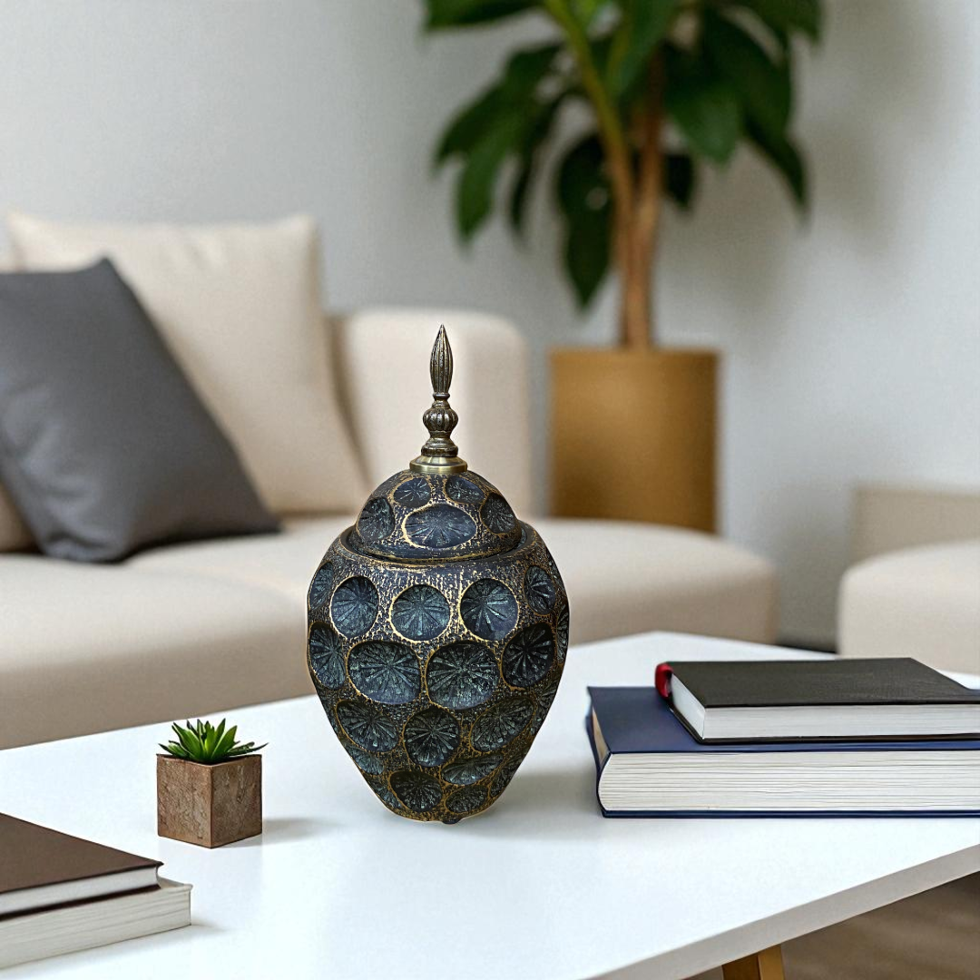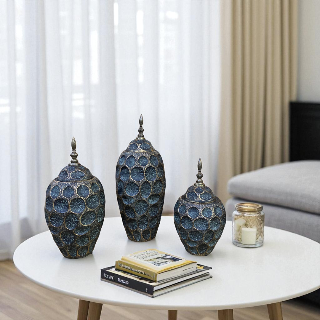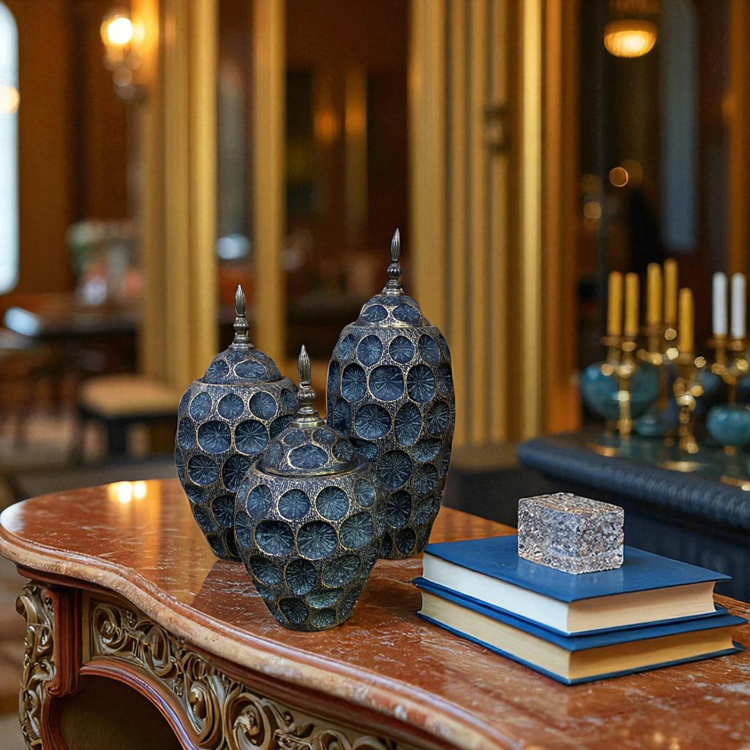 Elevate your interior with the Emerald Hive Textured Jar Set, a stunning 3-piece collection inspired by natural honeycomb patterns. Crafted with a deep emerald-green finish and accented in antique bronze tones, these jars exude both rustic charm and regal elegance.