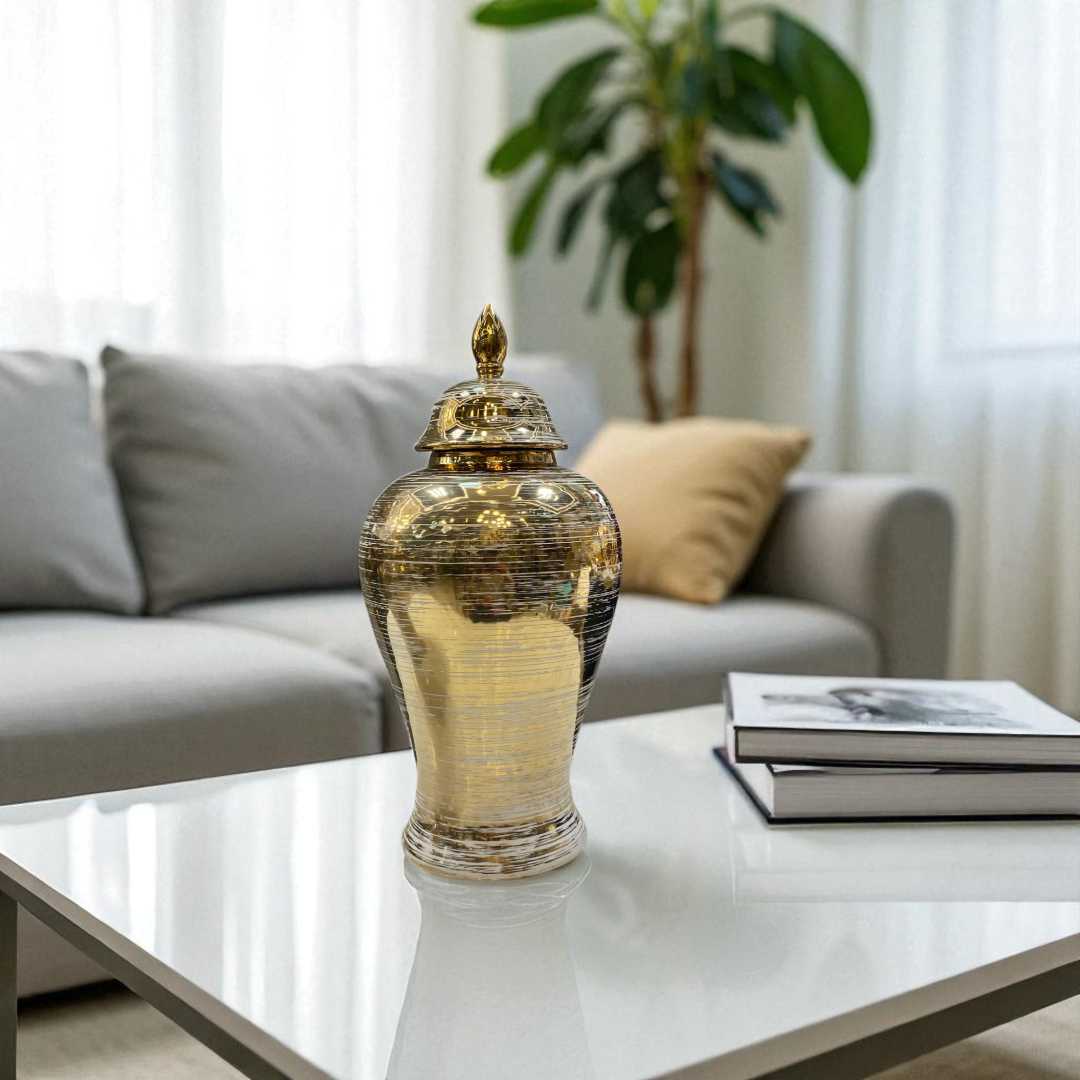 Elevate your interiors with the Golden Mirage Porcelain Jar Set, a dazzling 2-piece collection designed to capture attention and radiate luxury. Each jar features a brilliant gold metallic finish with subtle textured detailing, crowned with elegant finial lids that add to their regal appeal.