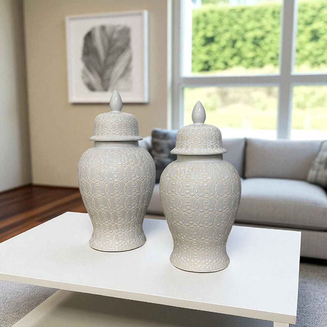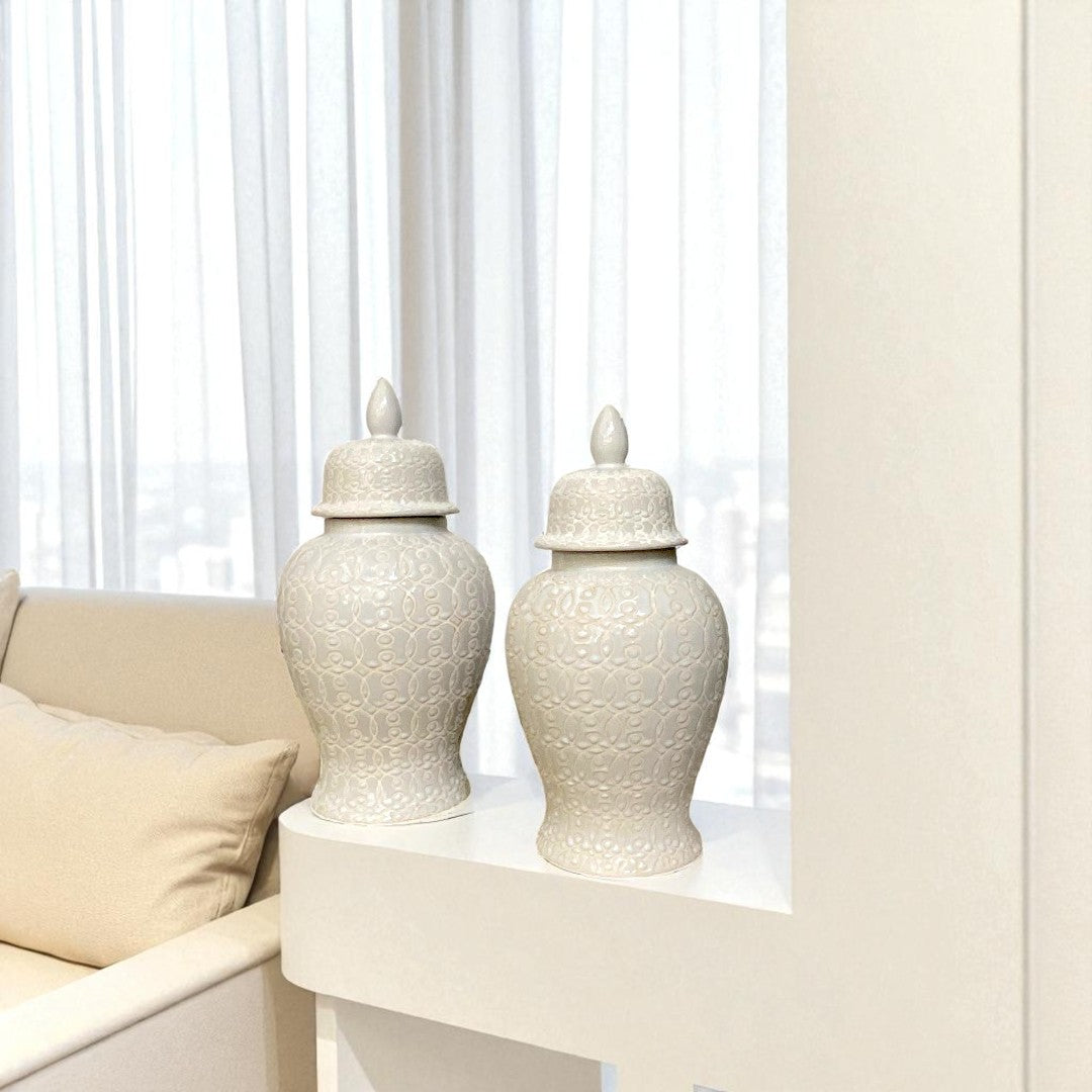 Bring timeless elegance into your home with this pair of white embossed ceramic ginger jars, designed to complement both modern and traditional interiors. The jars feature a smooth glazed surface with a delicate embossed geometric pattern, creating a refined and understated look. Topped with matching finial lids, they embody sophistication and balance.