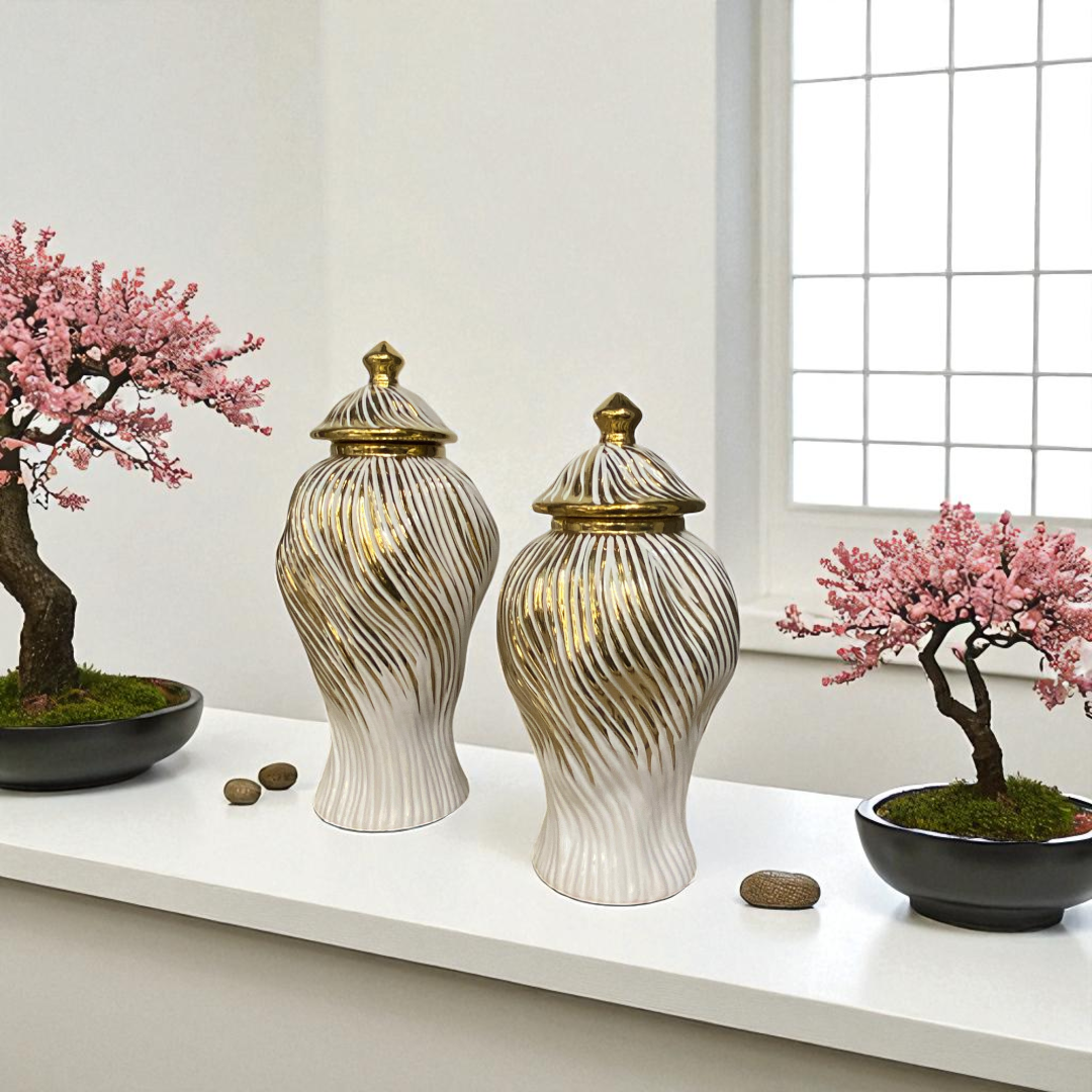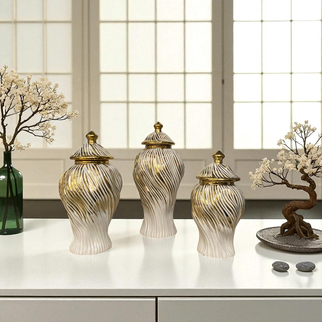 Elevate your home décor and serving style with this exquisite set of ceramic candy jars, crafted with meticulous attention to detail. Each jar features a sleek white base adorned with hand-painted golden accents in an elegant swirl pattern, creating a perfect blend of sophistication and charm. The lids are topped with ornate golden finials, adding a regal touch to the overall design.