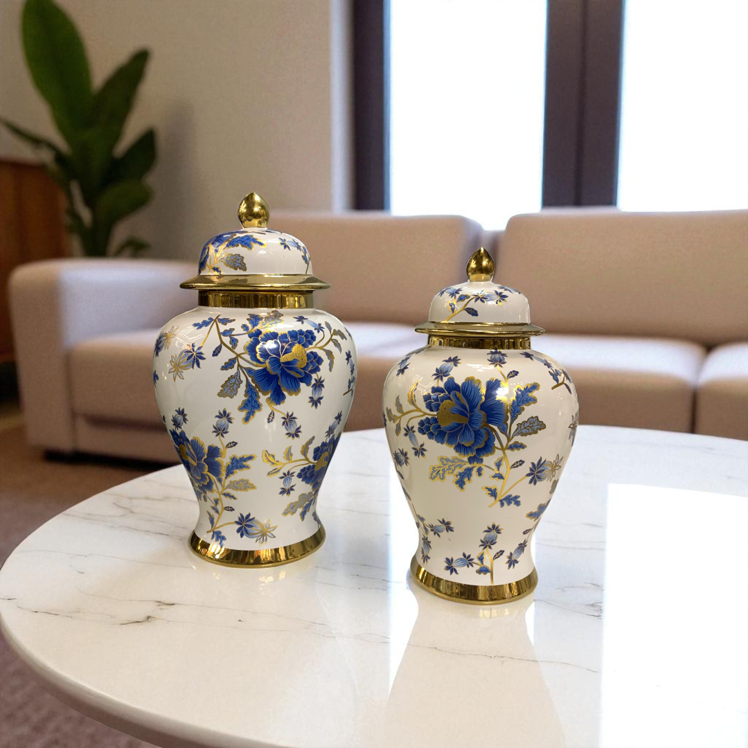 Refined elegance meets timeless artistry with the Imperial Blossom Porcelain Jars. This exquisite set of four jars is adorned with hand-painted blue floral motifs on a pristine white base, accented with luxurious gold detailing along the rims, lids, and bases.