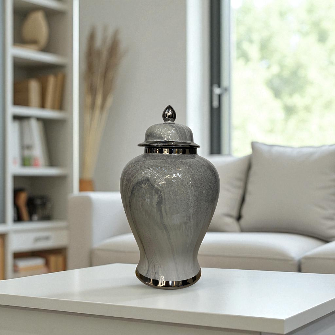 Bring understated sophistication to your décor with this Silver Mist ceramic jar set, featuring a smooth glossy finish and delicate marble-like veining in soft gray and white tones. Each jar is beautifully shaped with gentle curves and topped with a polished silver lid and finial, giving it a contemporary yet timeless appeal.