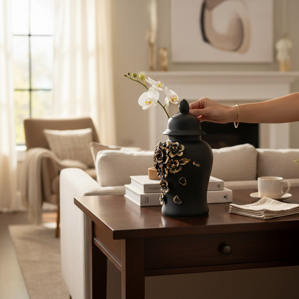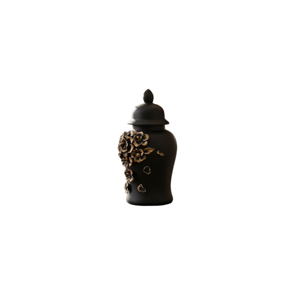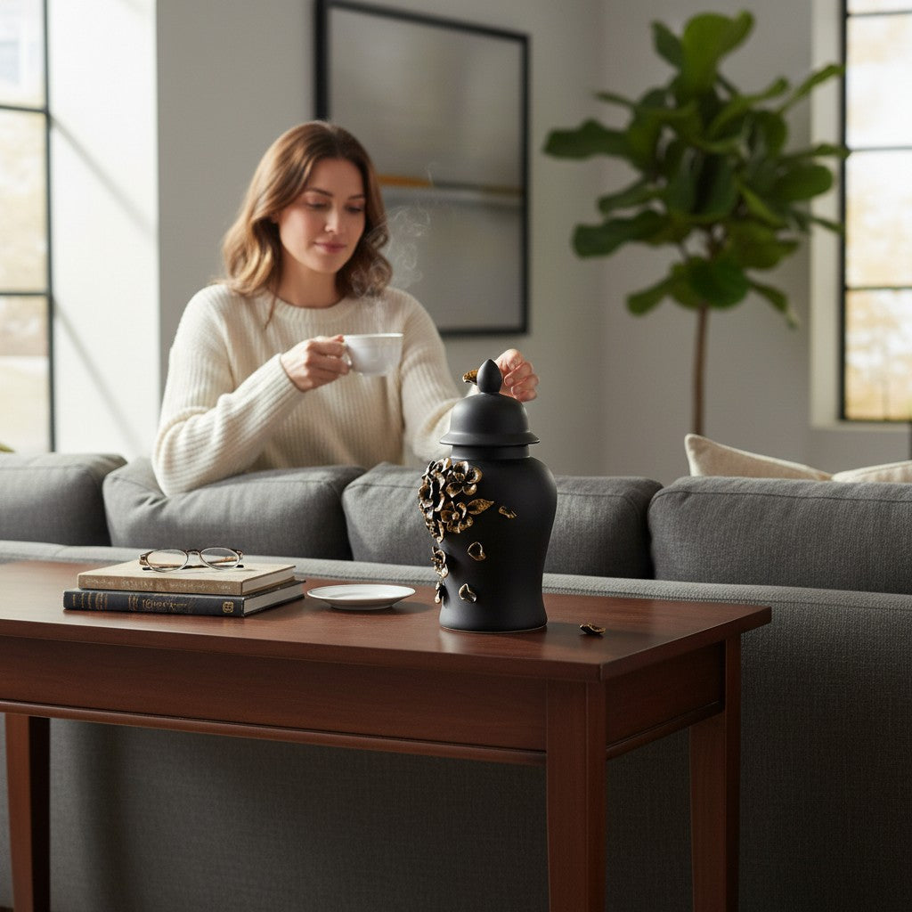The Midnight Elegance Ceramic Candy Jar is a refined blend of sophistication and modern design. Crafted in deep, velvety black ceramic, its smooth surface and graceful silhouette make it a timeless décor accent. Perfect for storing candies, treats, dry fruits, or even decorative fillers, it brings a touch of luxury to tabletops, coffee consoles, and kitchen counters. Minimal yet striking, this jar elevates any space with its bold color, elegant form, and understated charm—ideal for contemporary homes that value both style and functionality.
