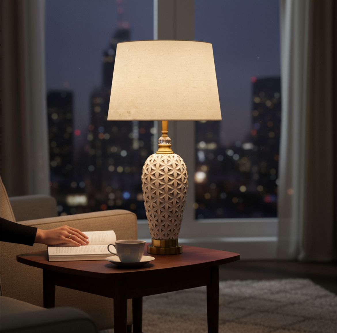 This tall ceramic lamp base features a striking geometric starburst texture across its surface, creating depth and visual intrigue. The matte white finish is subtly distressed, adding character, while the polished brass base and detailing bring a refined touch of luxury. Stylish and versatile, this lamp base is perfect for interiors that balance modern design with artisanal craftsmanship.