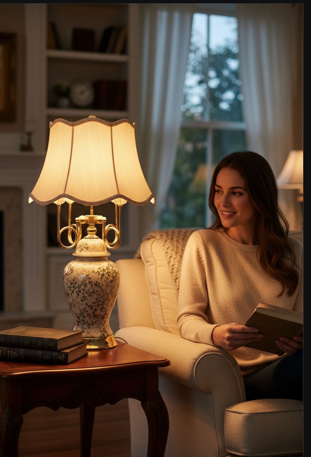 Perfect for traditional interiors, vintage-inspired settings, or as a statement accent in elegant living spaces, this lamp combines fine porcelain artistry with luxurious brass craftsmanship.