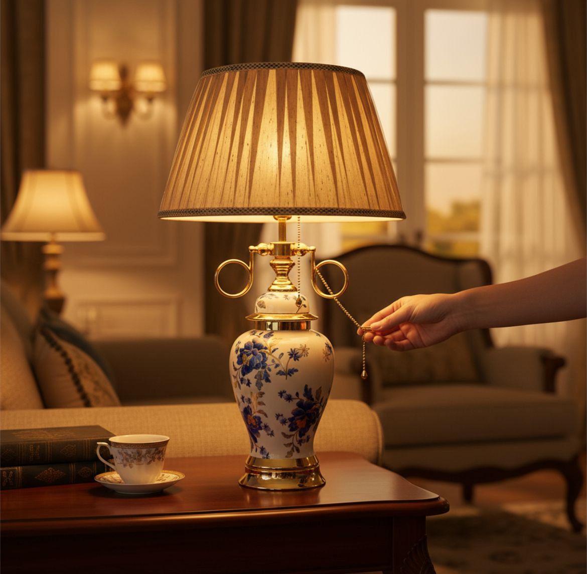 This elegant table lamp showcases a refined porcelain body in a crisp white glaze, beautifully decorated with hand-painted cobalt blue floral patterns. The timeless vase-shaped silhouette is complemented by polished brass elements at the base and neck, highlighting its sophisticated character. Ornate brass scroll arms add a touch of classic artistry, enhancing the lamp’s decorative appeal.