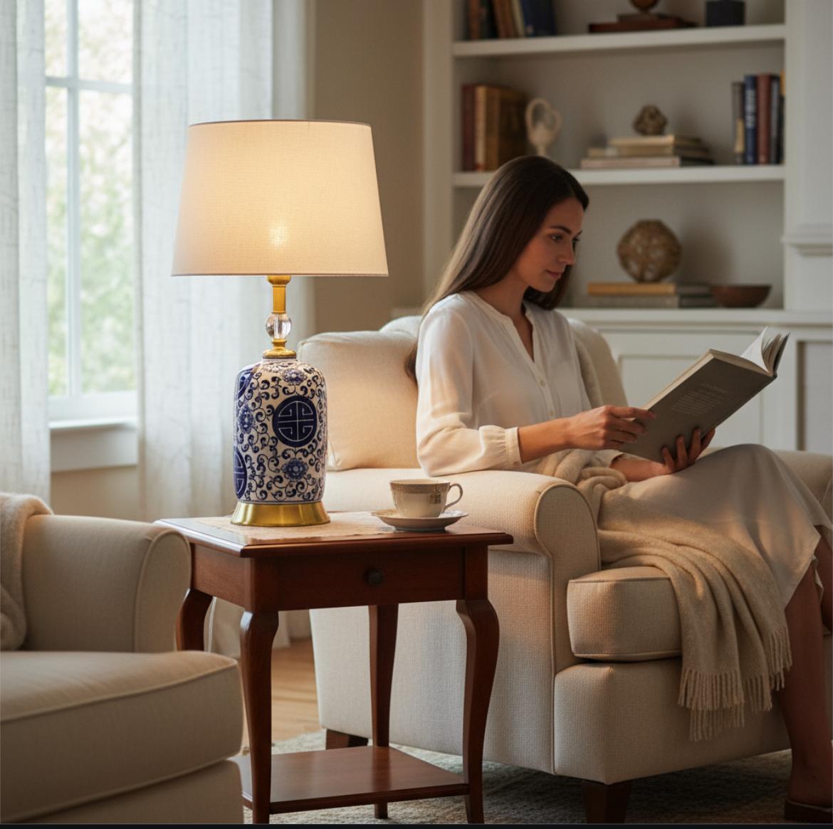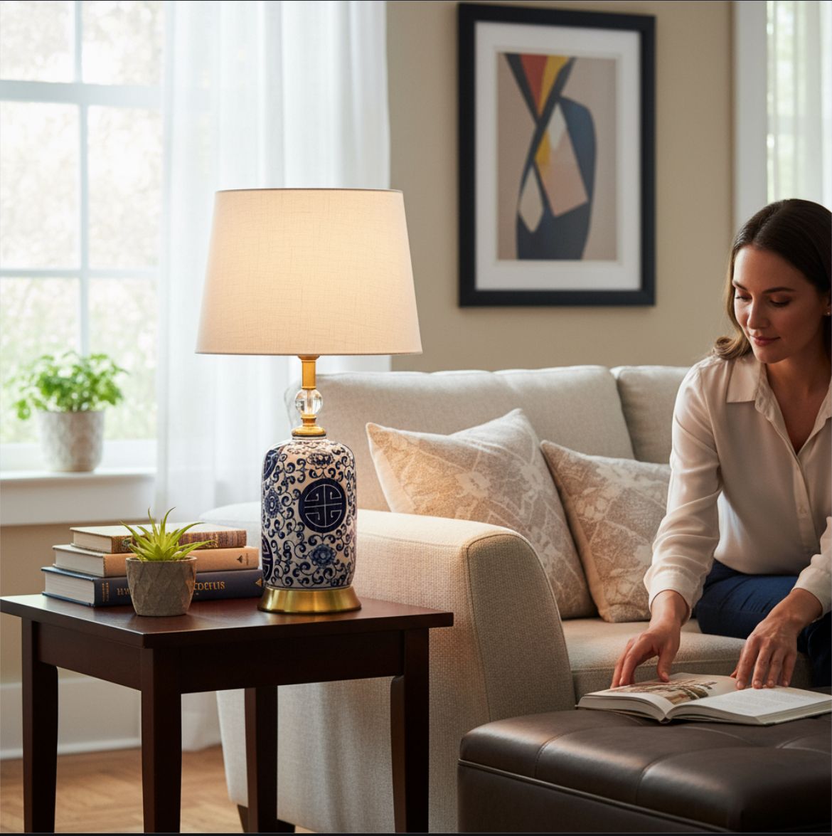 This elegant ceramic lamp base features a classic blue-and-white oriental design, adorned with intricate floral motifs and traditional circular emblems. The vibrant cobalt detailing contrasts beautifully with the smooth white surface, creating a timeless and artistic appeal. Resting on a polished brass base with matching accents, this lamp base seamlessly blends cultural charm with refined sophistication, making it a perfect statement piece for both modern and traditional interiors.