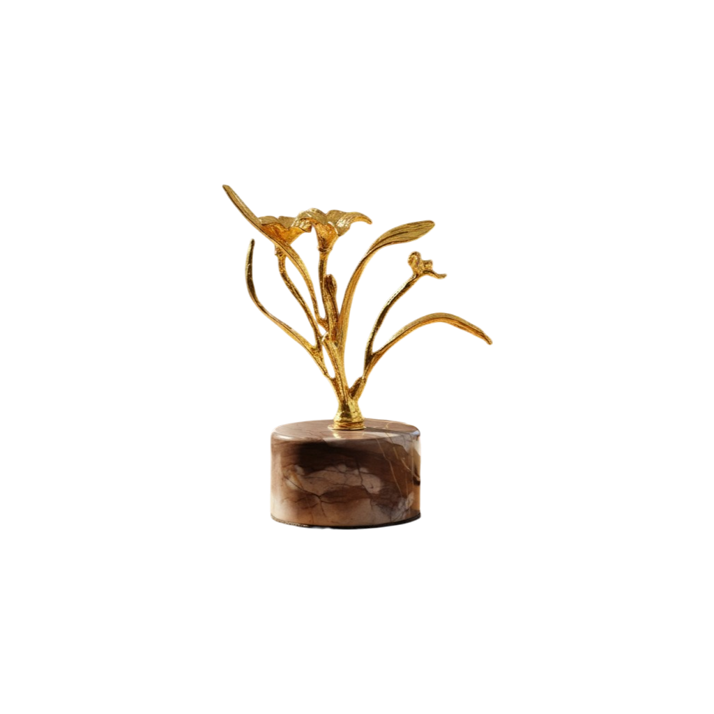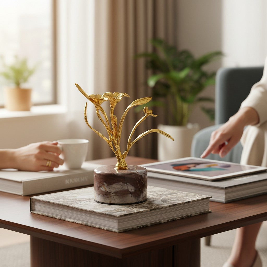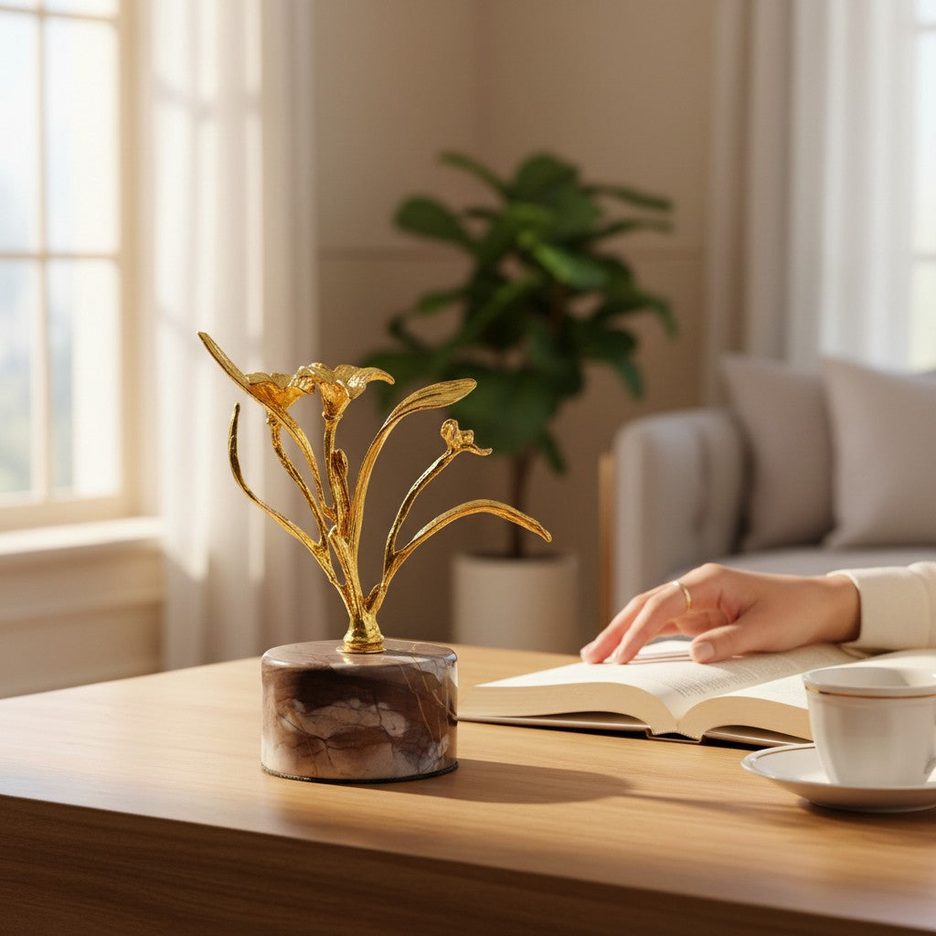 The “Golden Horizon Sphere” showcases a polished metallic orb held gracefully above a minimalistic base. Its clean design and warm golden tone make it an elegant standalone décor item, ideal for modern homes, boutique spaces, and luxury work environments. The raised form symbolizes elevation, ambition, and refined taste, making it a perfect statement piece.