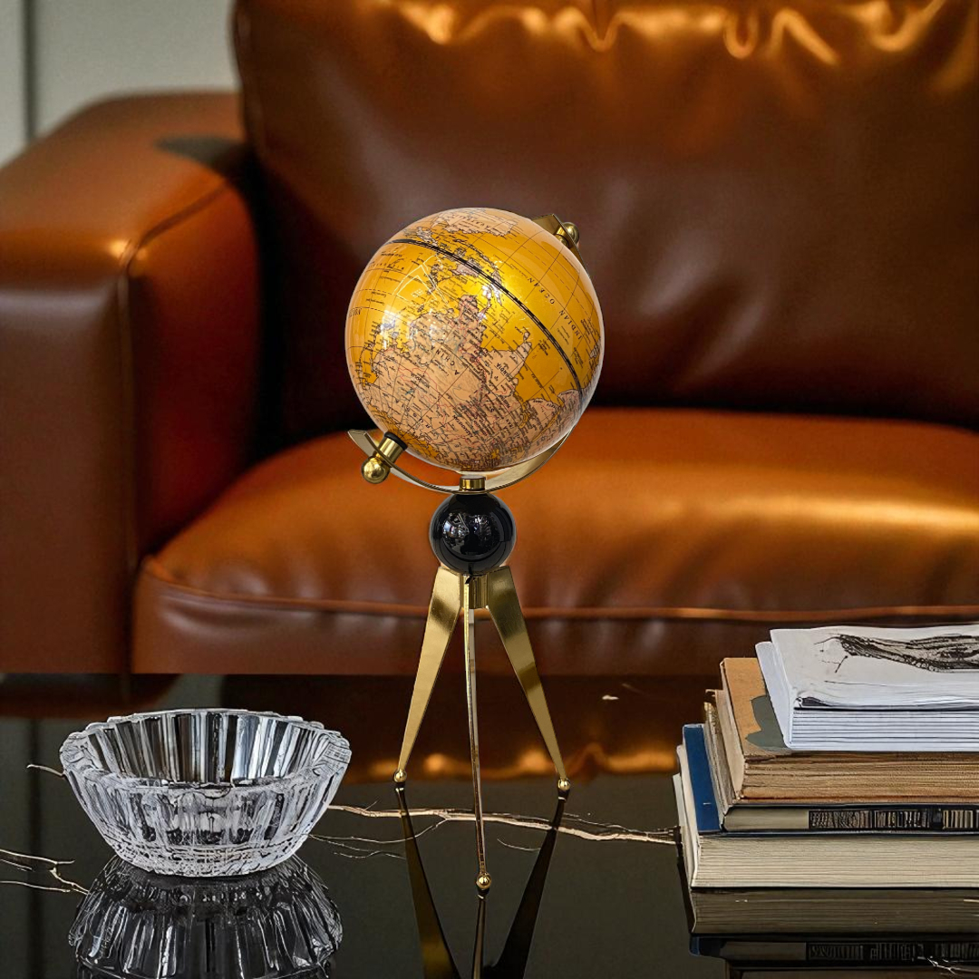 The Golden Atlas Decorative Globe is a sophisticated accent that celebrates timeless exploration. Resting on a sleek tripod base of polished gold with a black accent sphere, the globe features a warm golden-toned map design that adds a touch of vintage charm. Its compact size and elegant construction make it a perfect statement piece for desks, bookshelves, or study spaces. Both decorative and inspirational, this globe evokes curiosity, travel, and classic style.