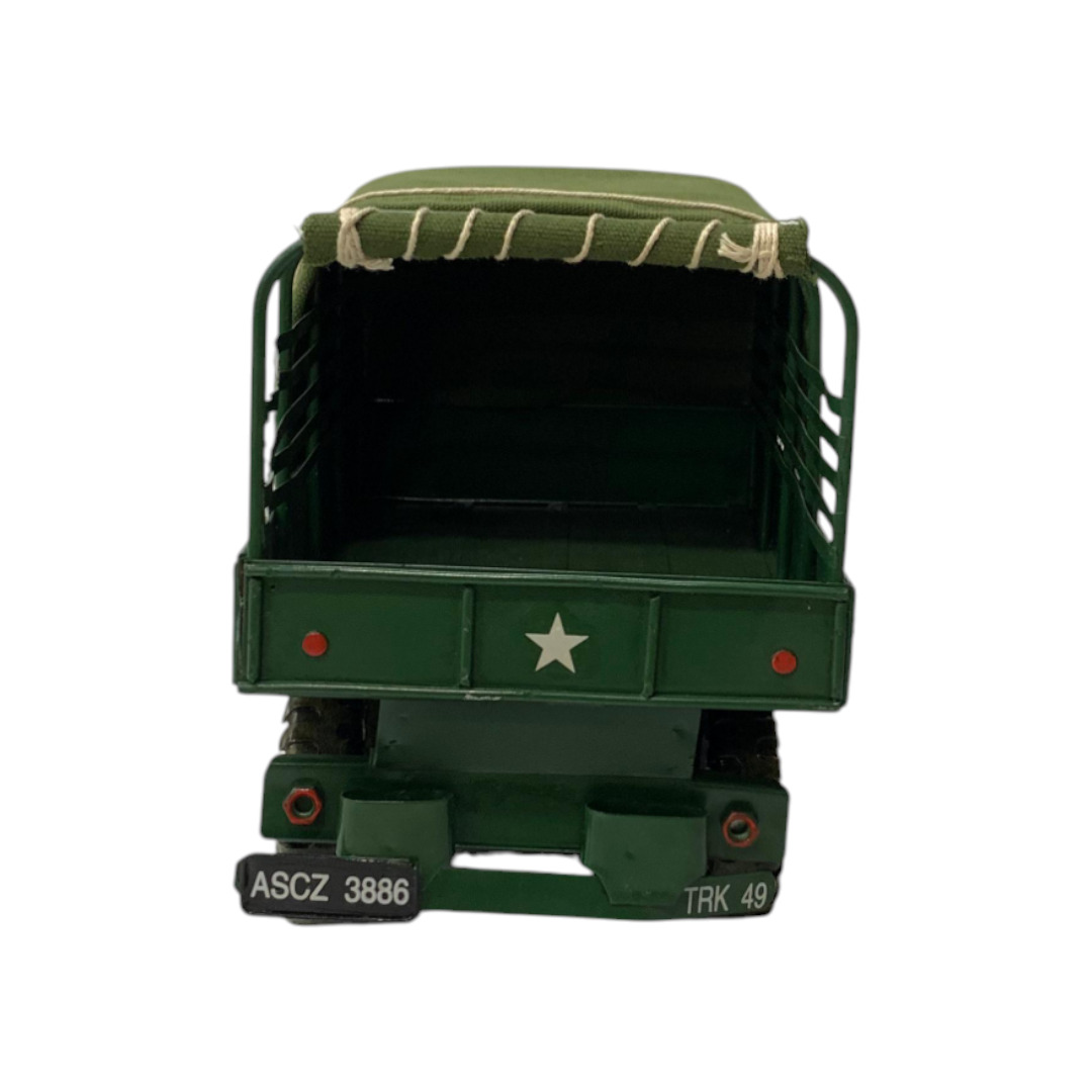 The Metallic Classic Military Truck Model is a highly detailed replica inspired by the rugged transport vehicles used during wartime. Finished in authentic olive-green with a weathered metallic look, it features a canvas-covered cargo area, star insignia, and six-wheel drive construction for a realistic military appearance. With intricate details such as front-mounted tow hooks, heavy-duty tires, and a reinforced bumper, this model captures the strength and utility of classic army trucks. Perfect for collectors and military history enthusiasts, it stands as a tribute to vintage battlefield engineering and transport power.