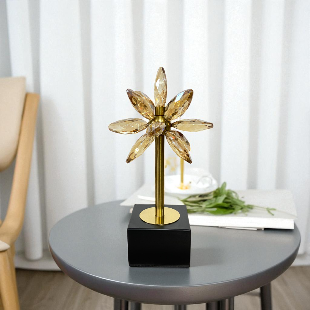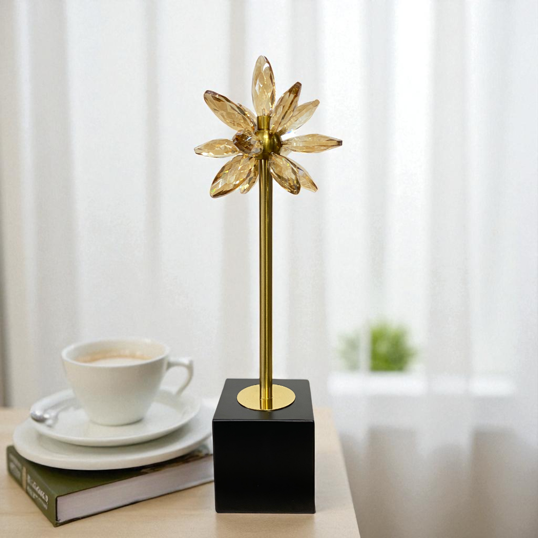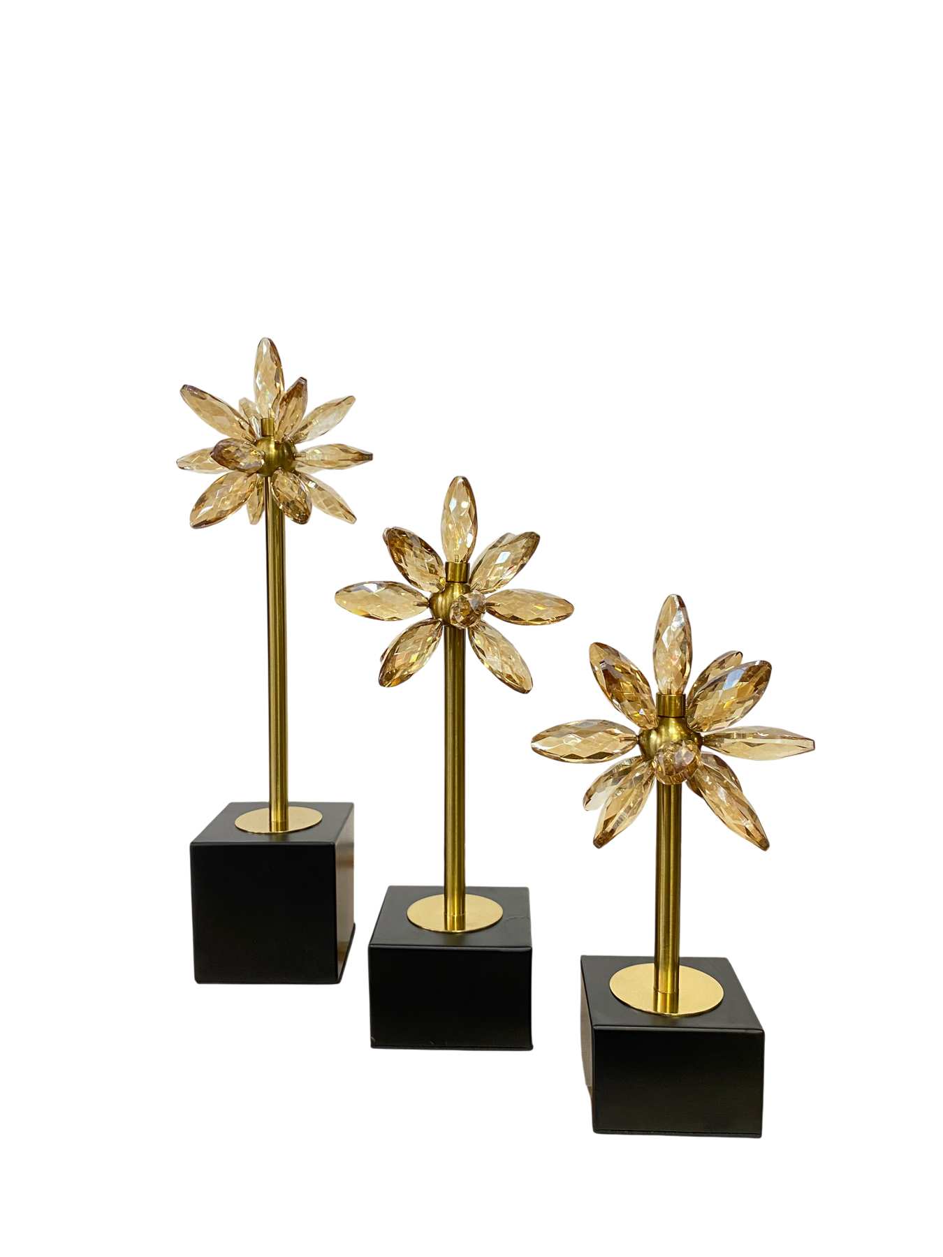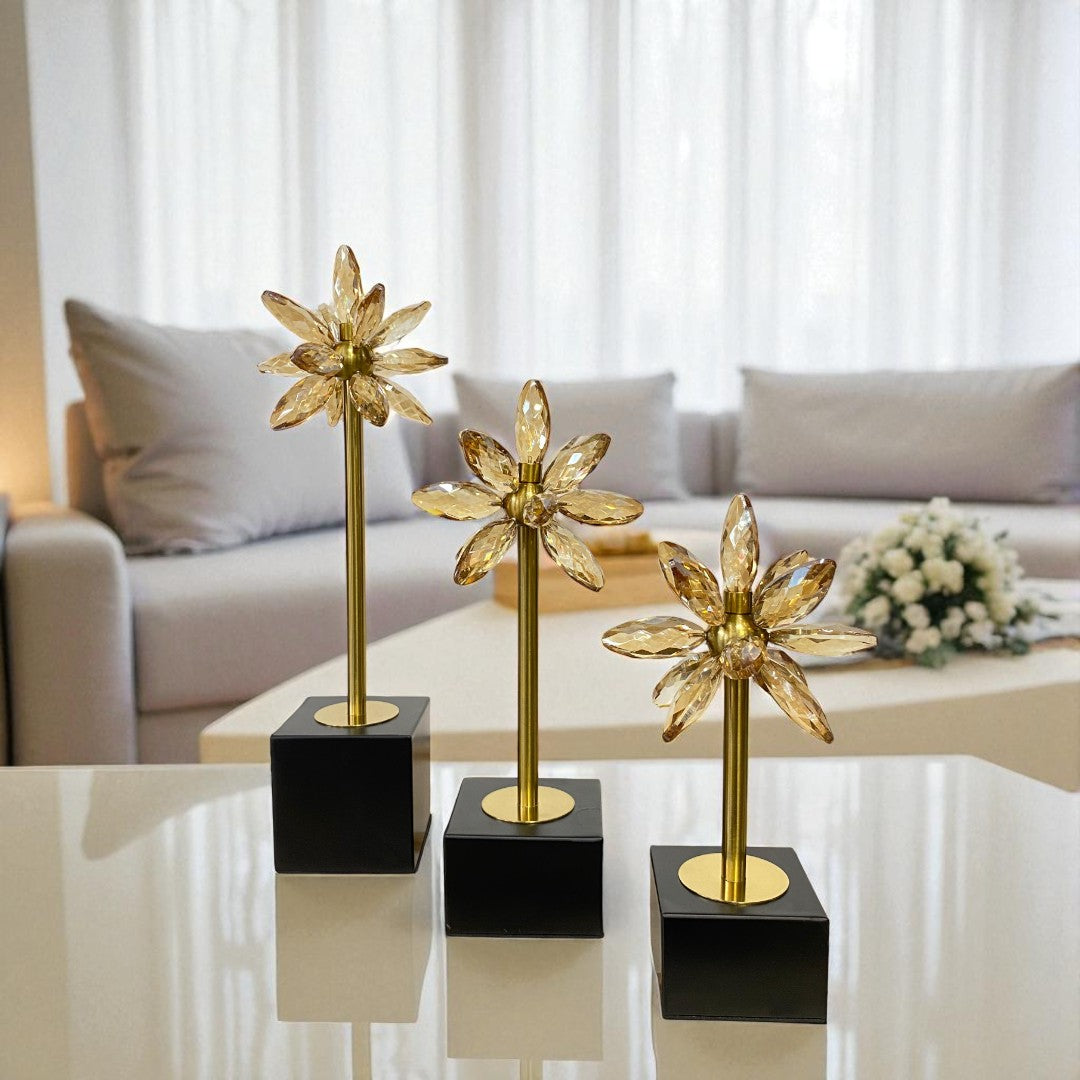 This is a set of three decorative crystal flowers. Each flower has a gold-colored stem and shiny crystal petals, placed on a black square base. The design is simple yet stylish, making it a nice choice for decorating tables, shelves, or desks at home or in the office.
