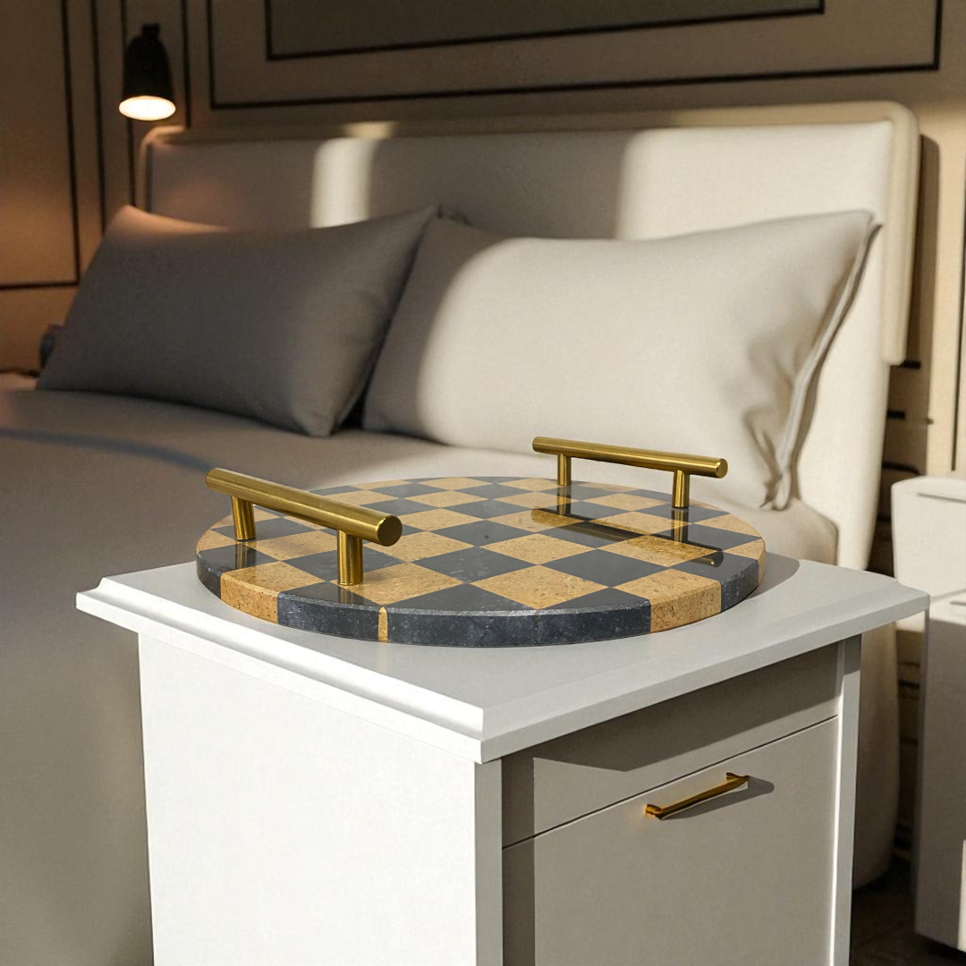 The Round Checkered Marble Tray is a striking blend of elegance and functionality. Crafted from alternating squares of natural marble in warm golden and deep charcoal tones, it creates a bold checkerboard design. The round shape is complemented by sleek brass handles, offering both style and practicality. Perfect for serving drinks, presenting desserts, or displaying decorative accents, this tray adds a luxurious touch to any dining or living space.