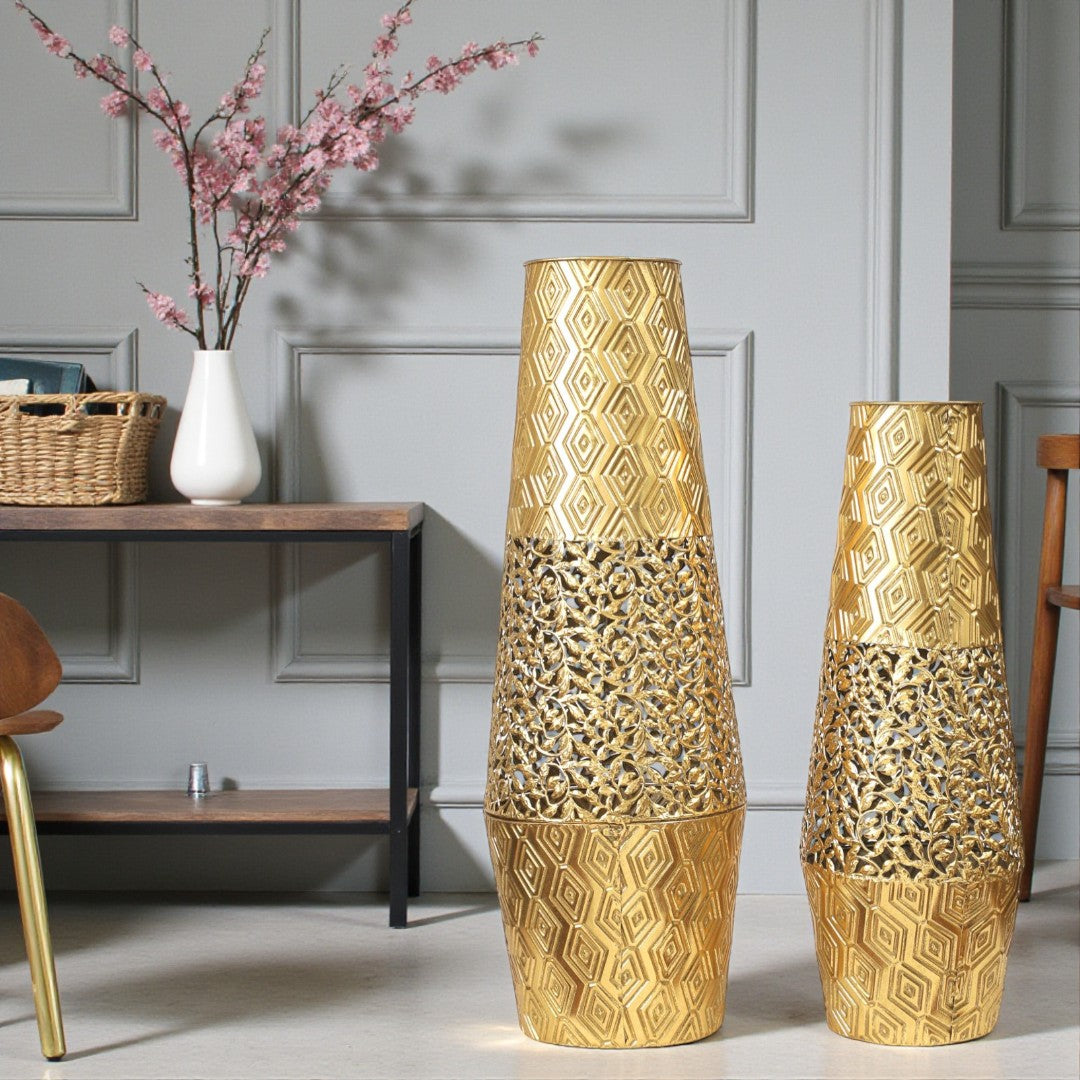 Elevate your interiors with the Aurelia Luxe Floor Planter by J Star. Designed with a radiant gold finish and intricate textured detailing, this statement piece brings timeless elegance and modern sophistication to any living room, hallway, or office space. Perfect for showcasing tall plants or decorative arrangements, it blends luxury with durability for lasting beauty.