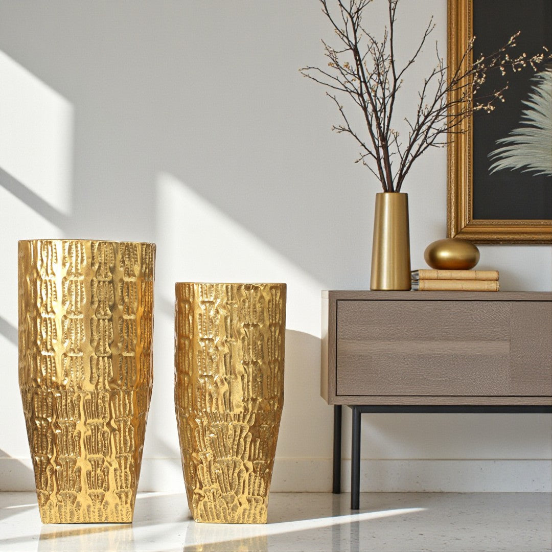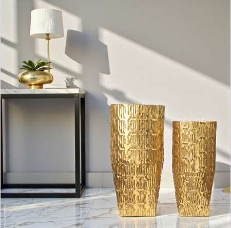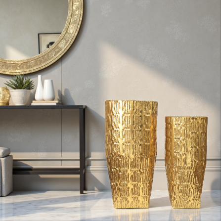 The Imperial Gold Floor Planter is crafted for those who appreciate grand design. With its shimmering metallic finish and detailed craftsmanship, this planter transforms any corner into a luxurious focal point. Durable, stylish, and versatile — perfect for homes, hotels, and upscale commercial spaces.