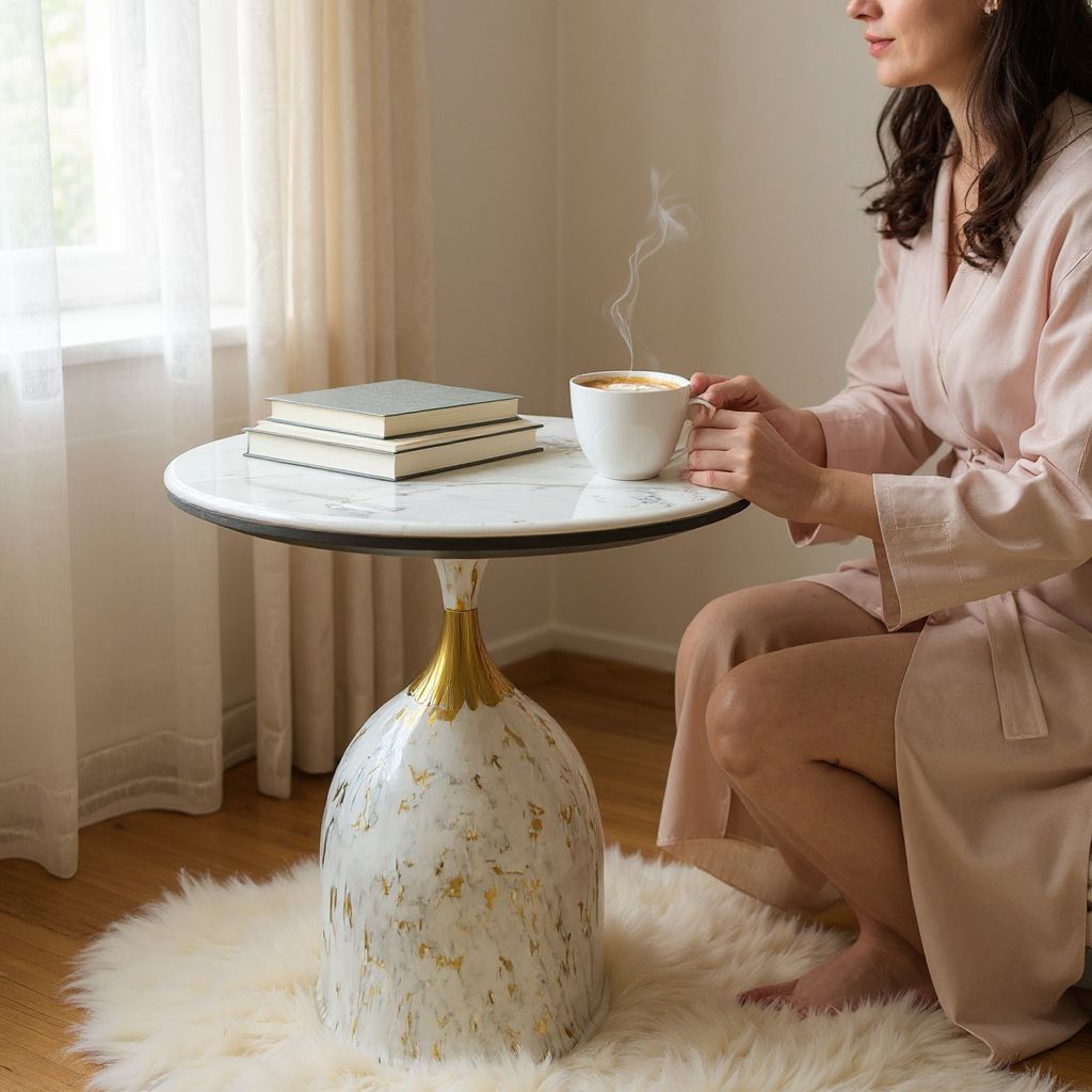 The Aurora Marble-Top Metallic Accent Table is where modern elegance meets timeless sophistication. Its smooth marble-texture surface evokes the beauty of natural stone, offering a luxurious touch that instantly elevates any space. Built with a sturdy metallic base in a warm, light-reflecting finish, this table combines structural strength with an airy, refined silhouette.