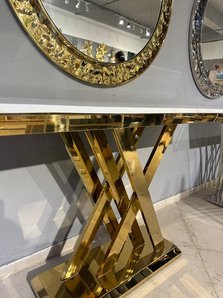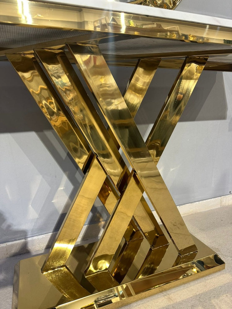 The Eminence X-Frame Console Table is the perfect harmony of strength and sophistication. Its sleek white ceramic top rests upon a bold interlocking gold-finished X-frame base, creating a striking geometric silhouette that elevates any space. Designed to impress, this console combines durability with luxury, making it ideal for entryways, living rooms, or dining spaces. A true statement piece that blends modern artistry with timeless elegance.