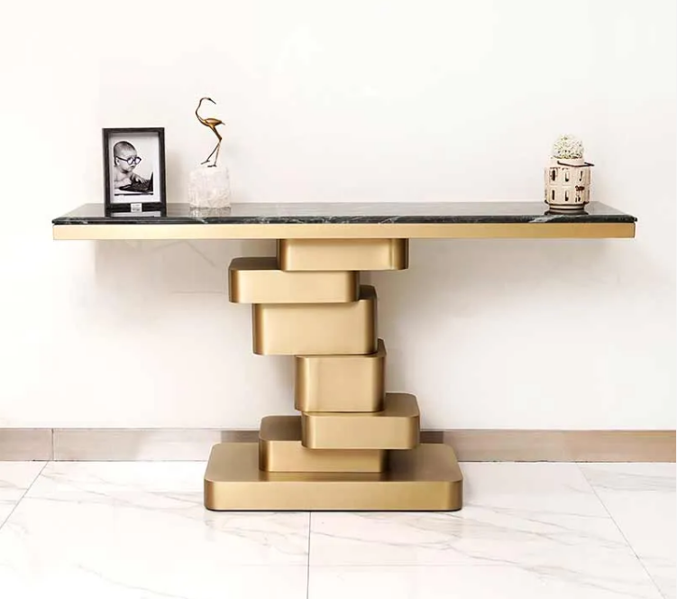 The Avant-Garde Stairway Console Table is a striking statement piece that merges modern design with architectural elegance. Featuring a bold, geometric stepped base finished in luxurious gold, this table exudes a sculptural presence that captivates the eye. The smooth rectangular tabletop provides a sleek contrast, making it a perfect addition to contemporary interiors. Whether placed in an entryway, living room, or hallway, this console table adds a touch of artistic sophistication while offering a functional surface for d茅cor and essentials.