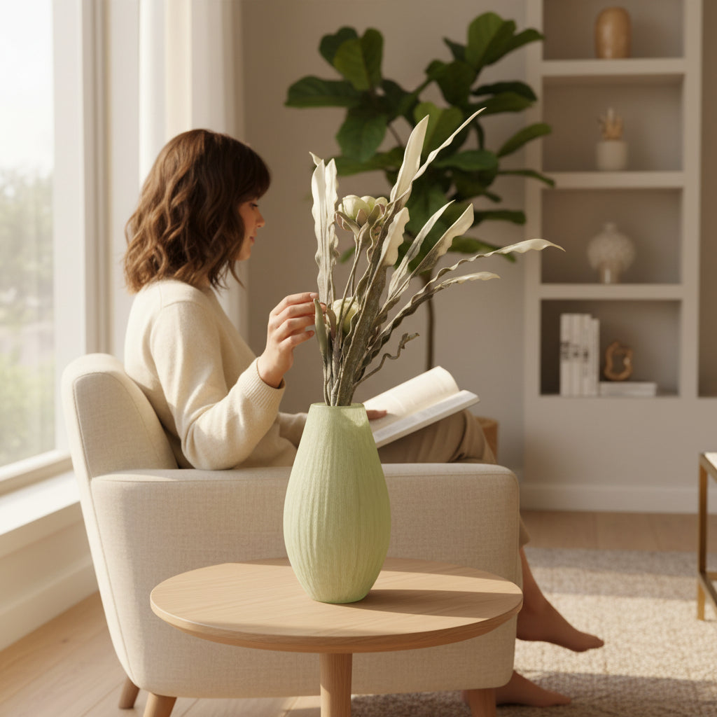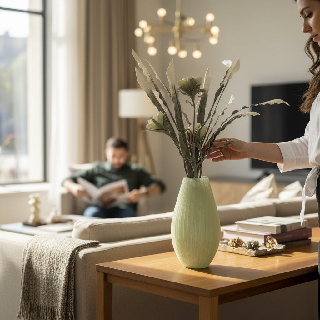 Designed for versatility, these vases can be displayed as a pair or used individually. The textured bases provide visual balance, making them suitable for both residential and commercial interior applications.