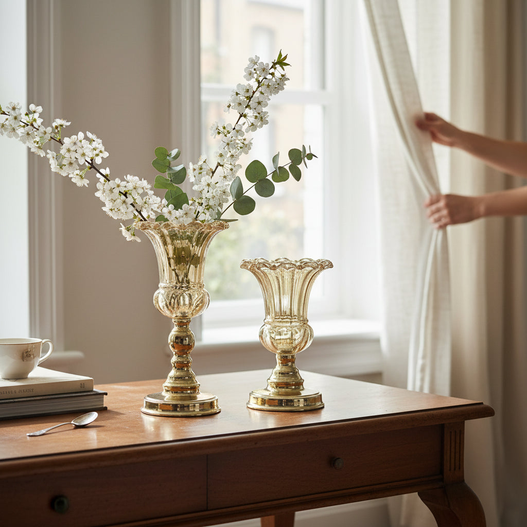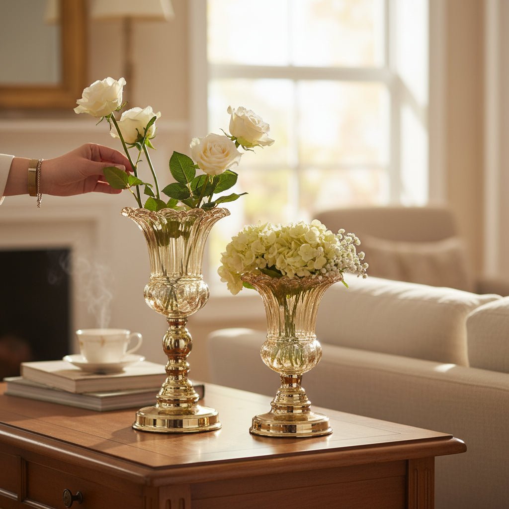 This exquisite glass vase bowl combines sophistication with timeless charm. Crafted from thick, high-quality glass with a shimmering gold-tone base and rim, it makes a striking centerpiece for any table or mantel. The intricate fluted design adds a touch of luxury, perfect for displaying flowers, decorative stones, or simply as a standalone statement piece. Its heavy, sturdy build ensures durability while enhancing its premium look. Ideal for home décor, weddings, or special occasions.