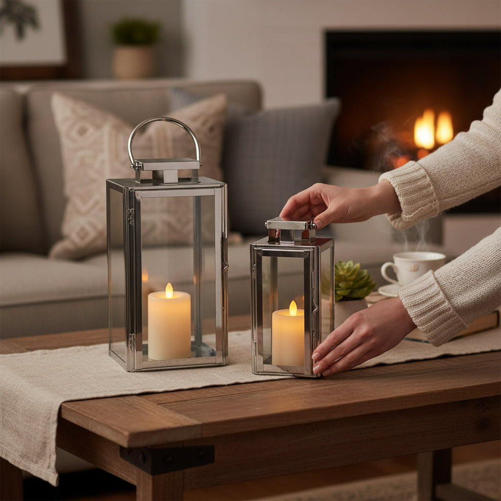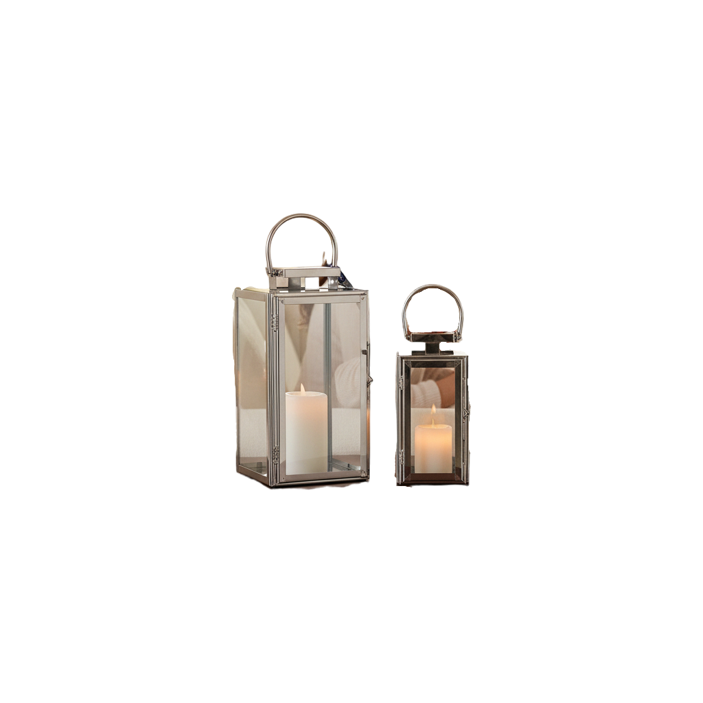 A sleek and modern set of glass lanterns framed in polished stainless steel, designed to bring a touch of contemporary elegance to any space. The clear glass panels allow candlelight to shine through beautifully, creating a warm and inviting ambiance. With sturdy handles for easy placement, these lanterns are perfect for both indoor and outdoor settings, making them ideal for home décor, patios, and special occasions. Available in multiple sizes to suit various styling needs.