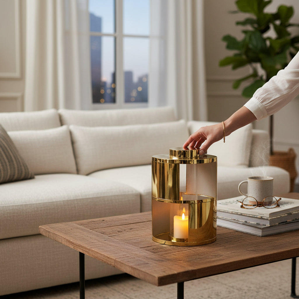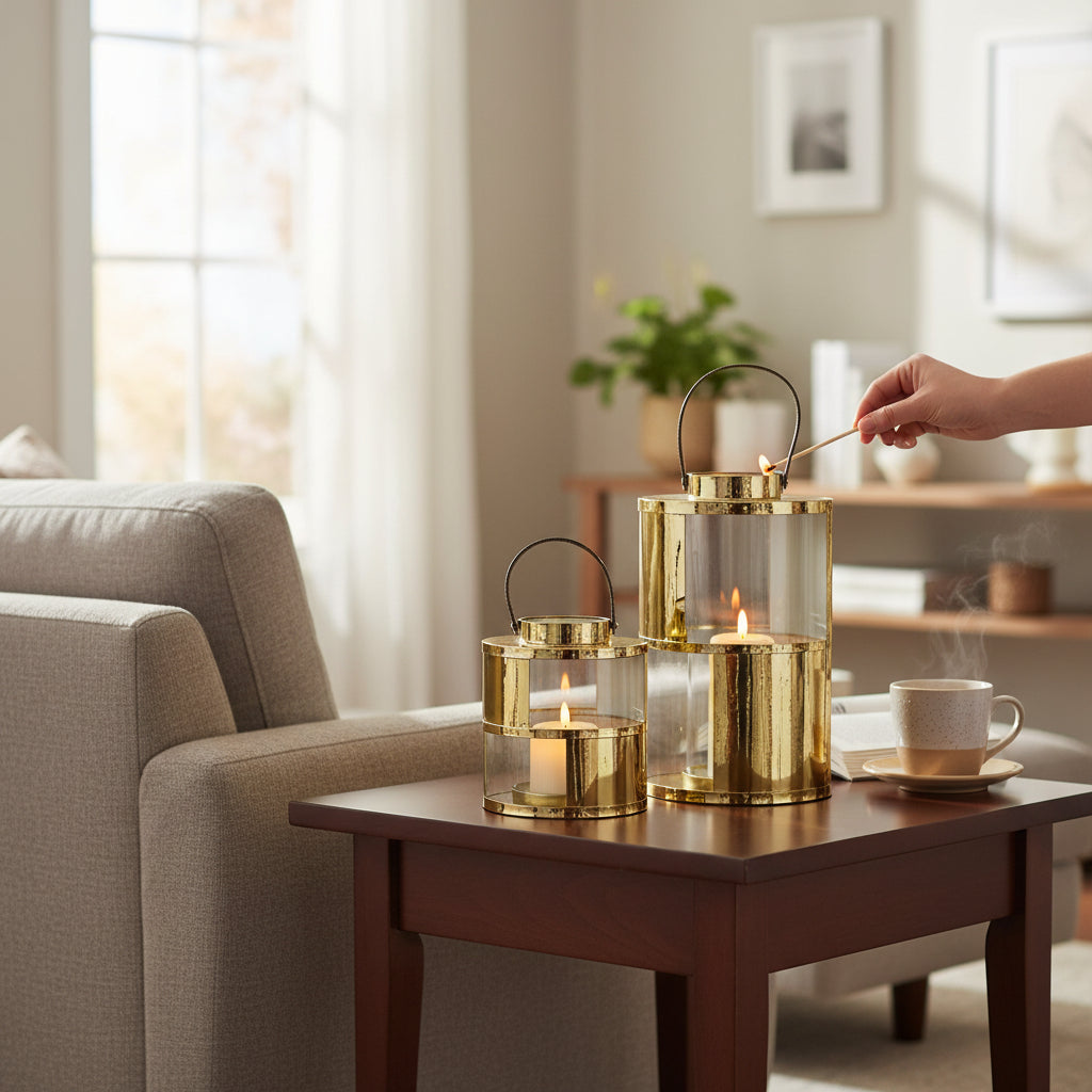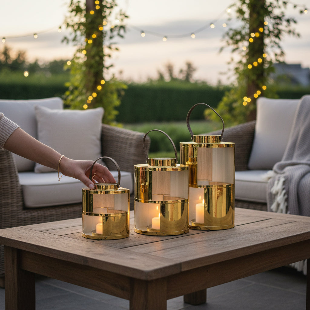 A lantern is a decorative and functional piece that exudes warmth and elegance. Typically crafted from durable metal with a polished, brushed, or antiqued golden finish, these lanterns are designed to emit a soft, inviting glow when lit. The golden hue enhances the ambiance, adding a luxurious touch to any setting.
