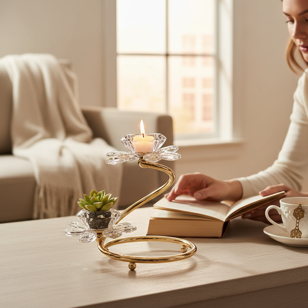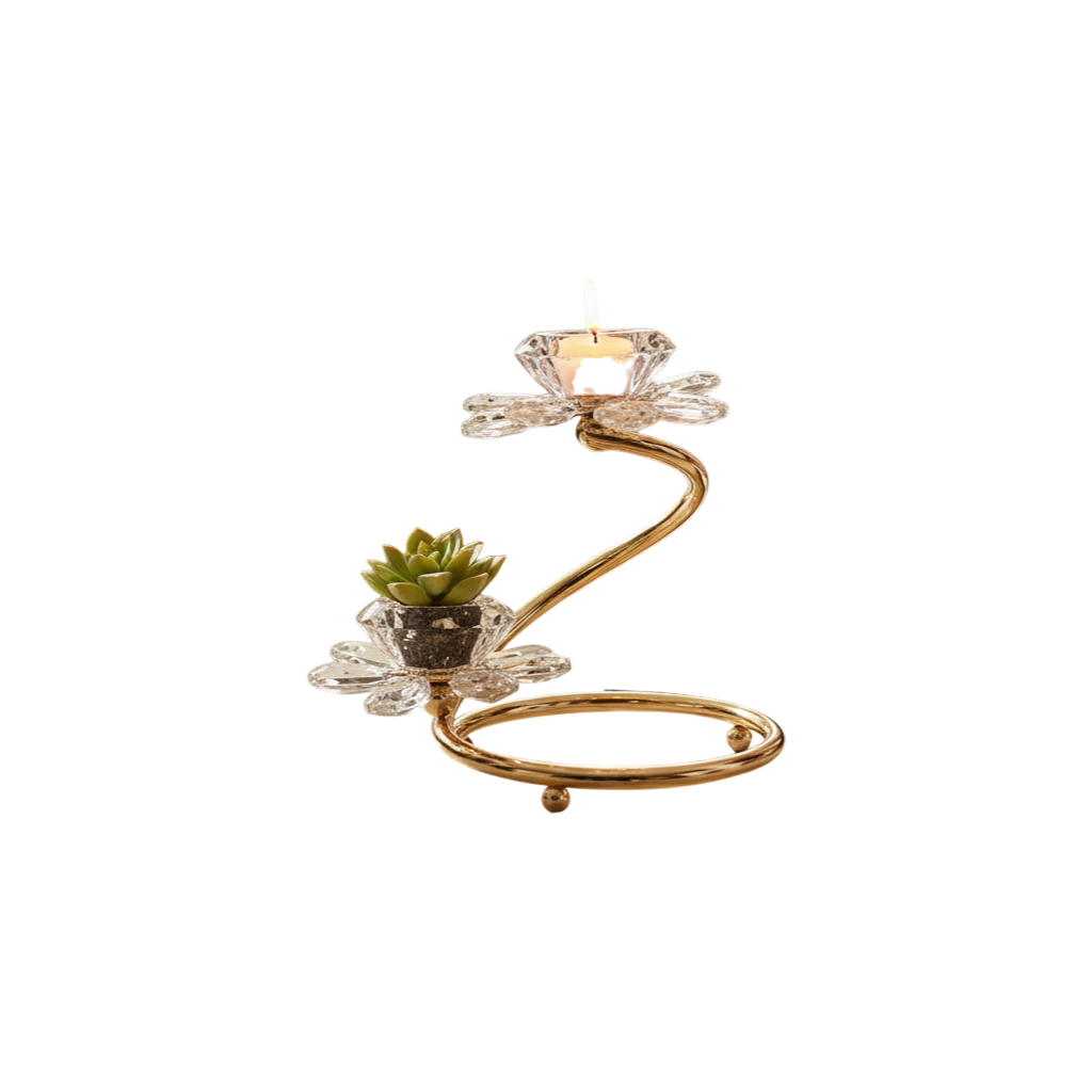 The Celestia Crystal Lotus Metallic Candle Stand is a stunning blend of modern elegance and timeless symbolism. Designed with delicately shaped lotus petals adorned with sparkling crystal accents, this candle stand reflects light beautifully, creating a warm and luxurious ambiance. The sleek metallic finish enhances its contemporary appeal, making it a perfect statement piece for dining tables, consoles, festive décor, or spiritual spaces. Both decorative and functional, this exquisite candle stand adds sophistication and radiant charm to any interior setting.