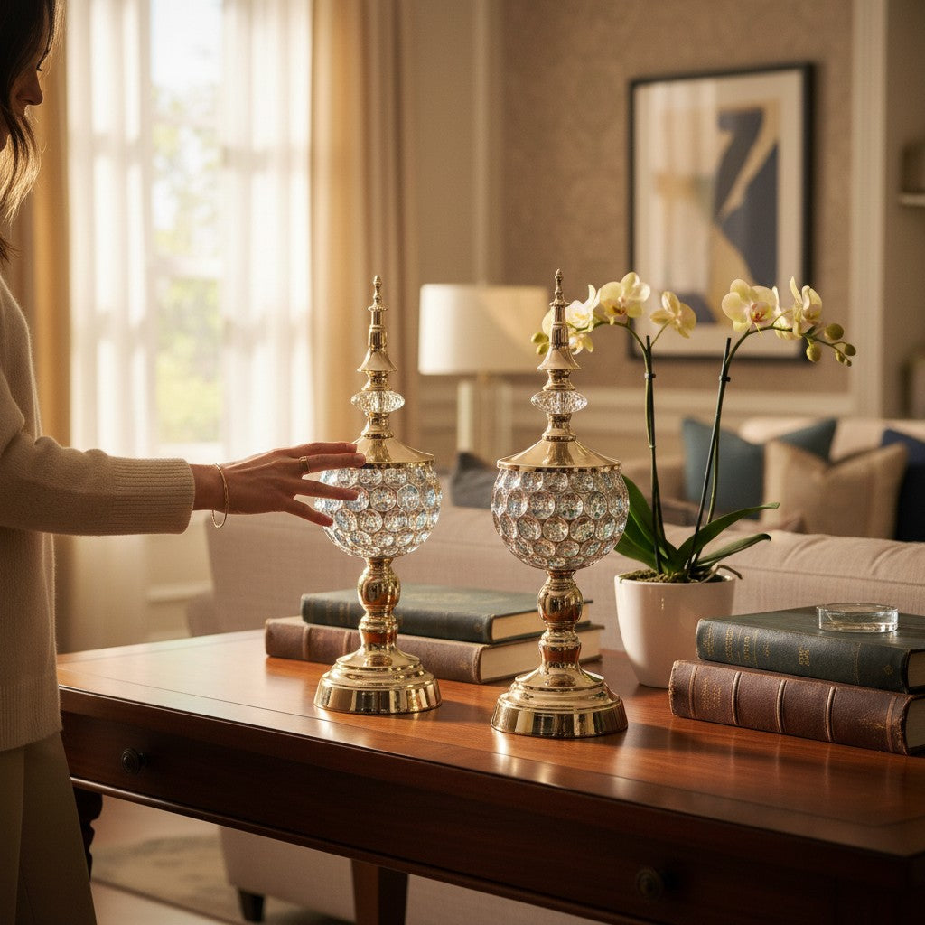 The "Ethereal Serenity Metallic Glass Candle Holder with Gleaming Accents" is the perfect marriage of simplicity and luxury. Featuring a shimmering metallic finish paired with delicate glass details, this stand enhances any candle’s glow, creating a serene, peaceful atmosphere. Its refined, minimalist design works beautifully in both contemporary and traditional interiors, offering a sophisticated way to illuminate your space. Ideal for enhancing the mood in living rooms, dining areas, or bedrooms, this candle holder brings a touch of ethereal charm wherever it’s displayed.