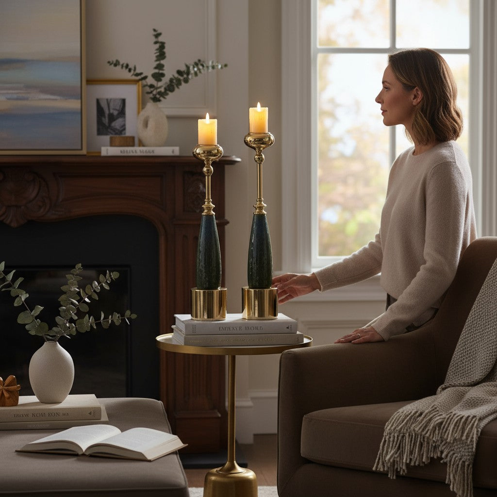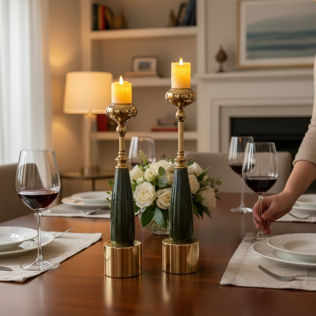 The Obsidian Rise Candle Holder is a statement of refined strength and artistic balance. With its vertically stacked black spheres and crystal-clear glass shade, it brings structure and drama to any setting. The deep matte finish contrasts beautifully with the warm candlelight, casting soft, architectural shadows that enhance contemporary interiors.
