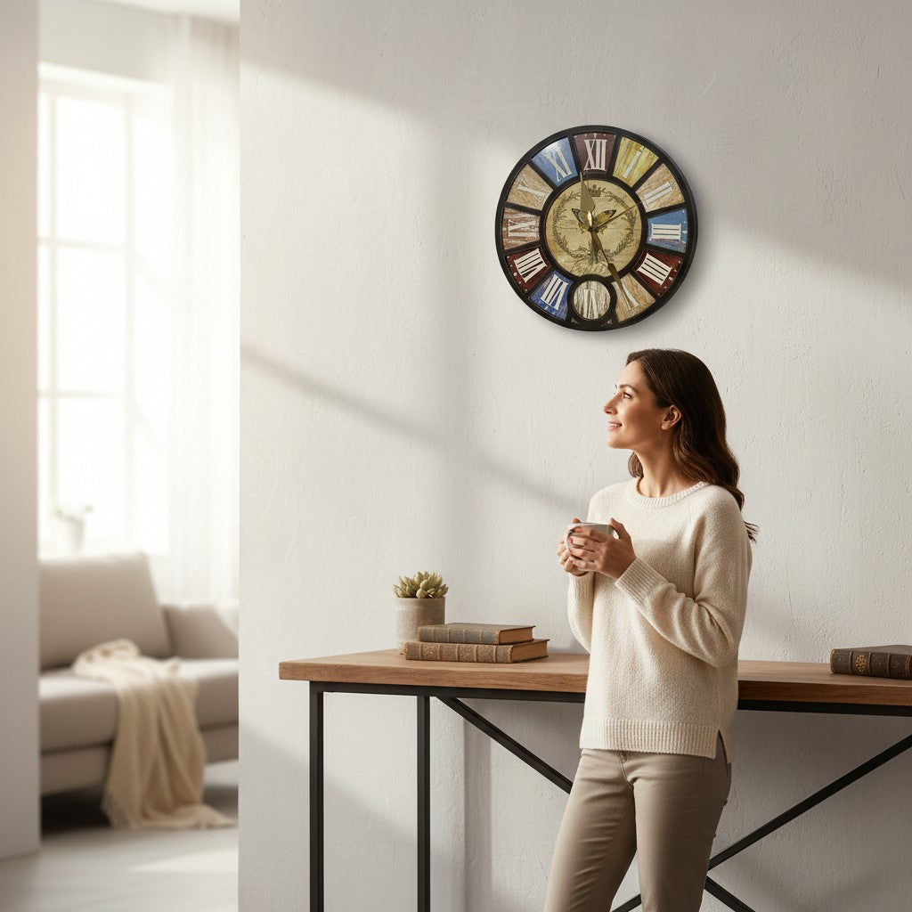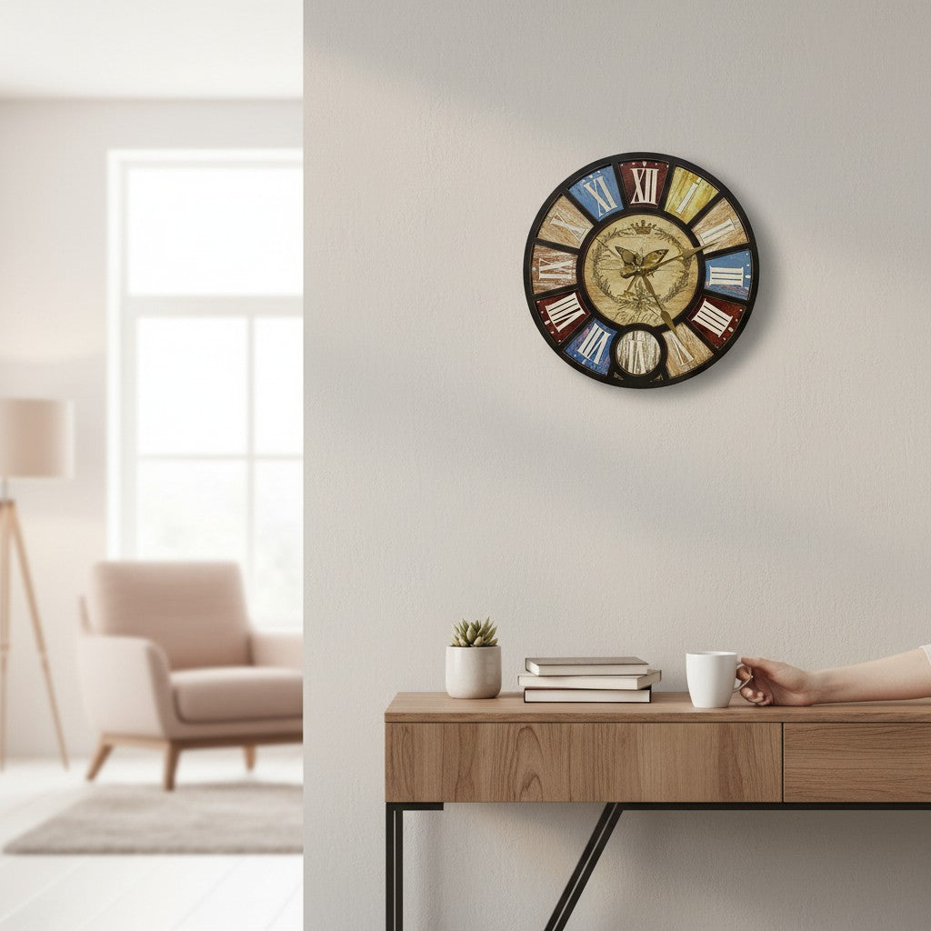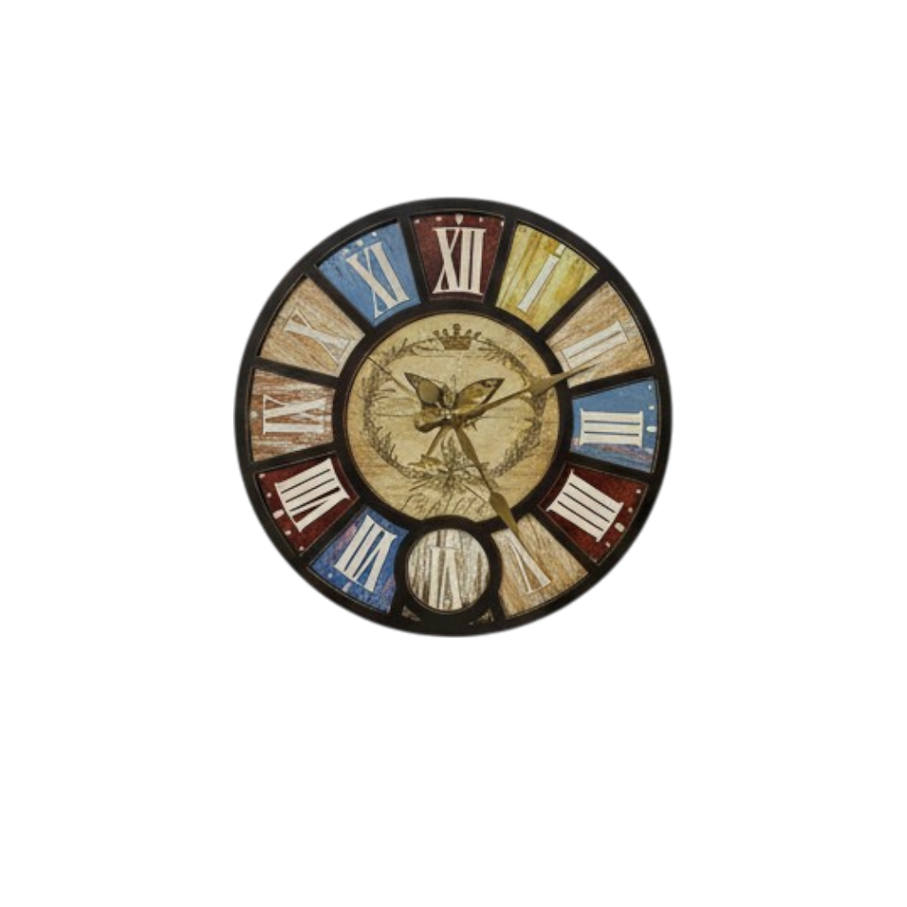 This stylish wall clock features bold black borders enhanced with a beautiful multicolor design and elegant golden butterfly accents. The combination of vibrant colors and metallic detailing creates a unique, eye-catching look that brightens any room. With clear numerals and a smooth, easy-to-read dial, this clock blends beauty and practicality—perfect for living rooms, bedrooms, study areas, and modern décor spaces. A charming decorative piece for anyone who loves colorful elegance with a golden touch.
