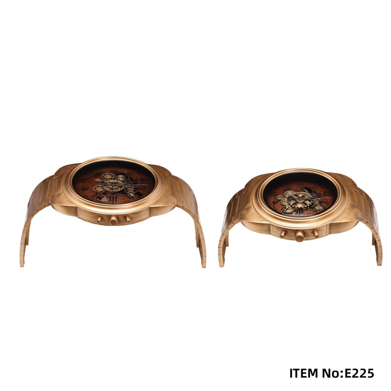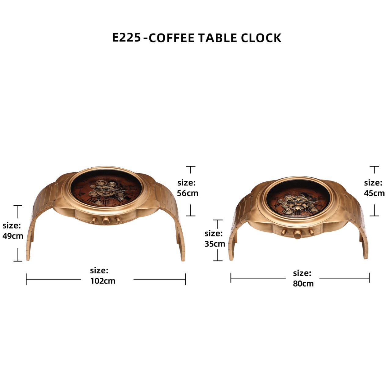 Each table features a real clock face with moving gear mechanisms, adding a touch of motion and charm. The polished edges and brilliant gold finish give it a majestic presence that reflects refined taste and timeless allure.