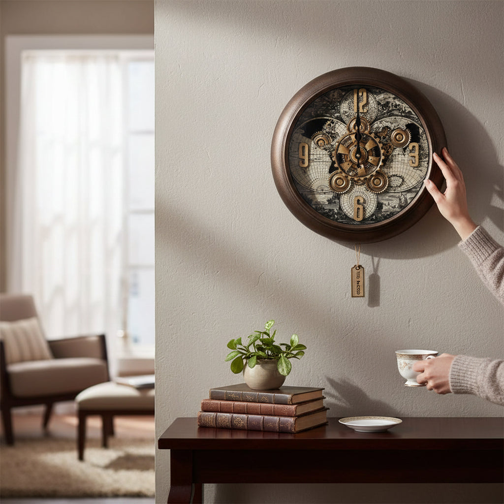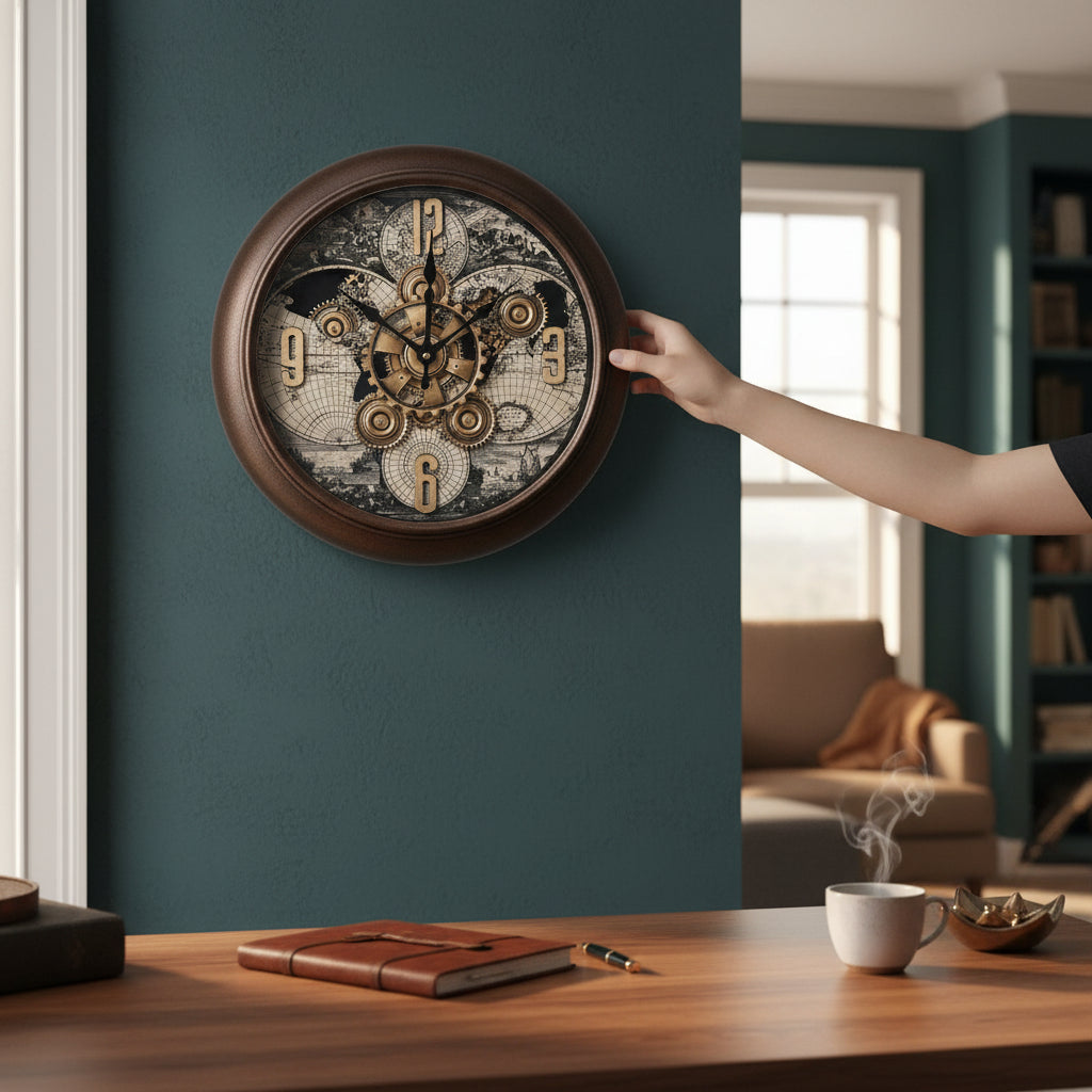 Combine art, function, and industrial elegance with the Navigator’s Gearfloor Clock. This striking piece features a world map design with intricately moving metallic gears, creating a dynamic visual centerpiece that doubles as a side table. Crafted from high-quality metal, its robust construction and sophisticated design make it perfect for living rooms, offices, or study spaces. The unique fusion of a floor clock, side table, and mechanical artistry turns any corner into a conversation starter. Functional, durable, and full of character, the Navigator’s Gearfloor Clock is the ultimate statement piece for lovers of vintage-industrial décor and world-inspired design.