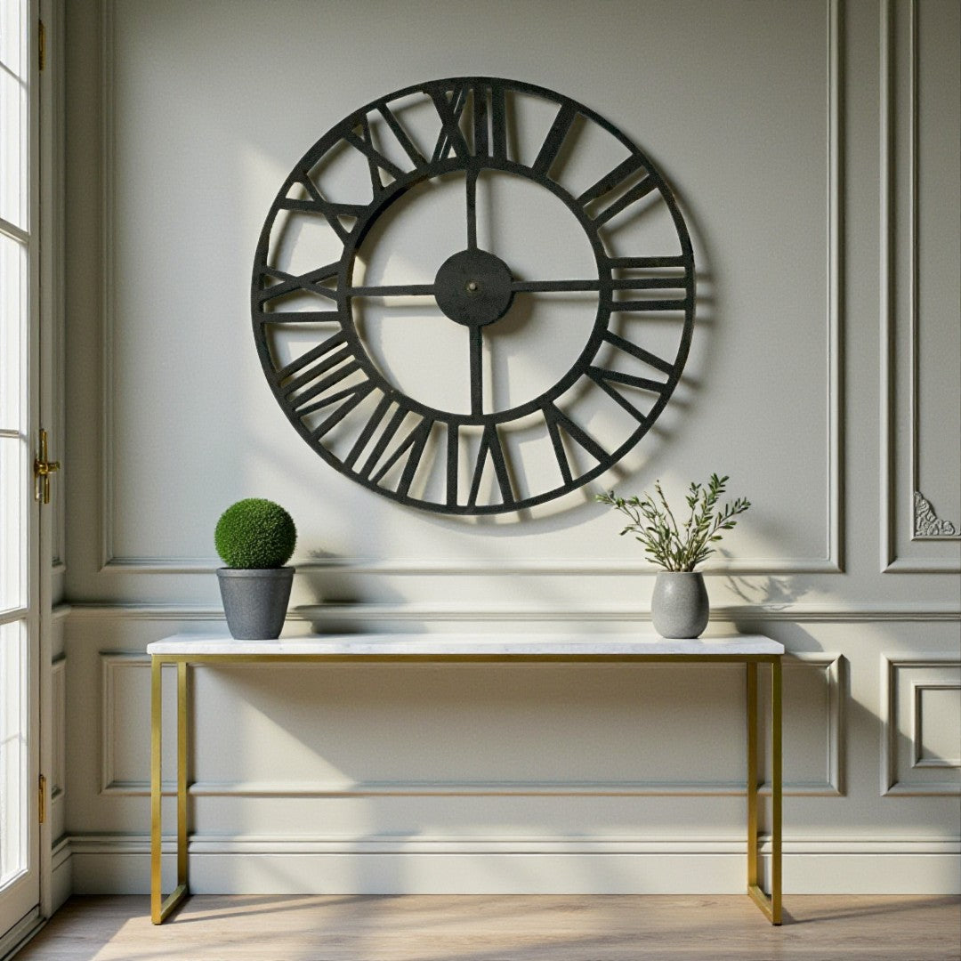 The Timeless Iron Roman Wall Clock is a beautifully crafted open-frame timepiece featuring bold Roman numerals and a clean, minimal structure. Made from sturdy iron, its elegant black finish adds a touch of vintage sophistication while remaining modern and versatile. The open-back design allows the wall’s color or texture to show through, creating a stylish floating effect.