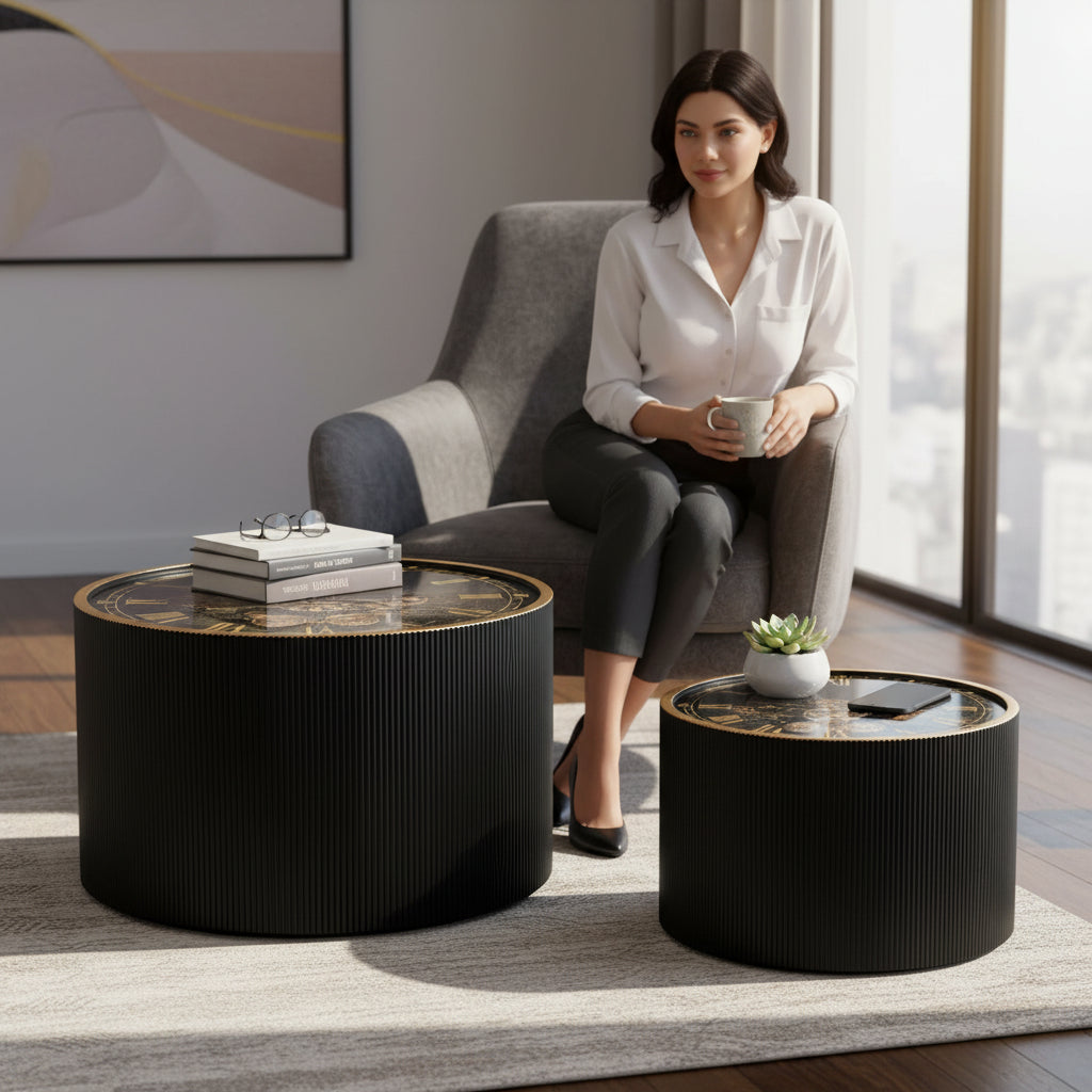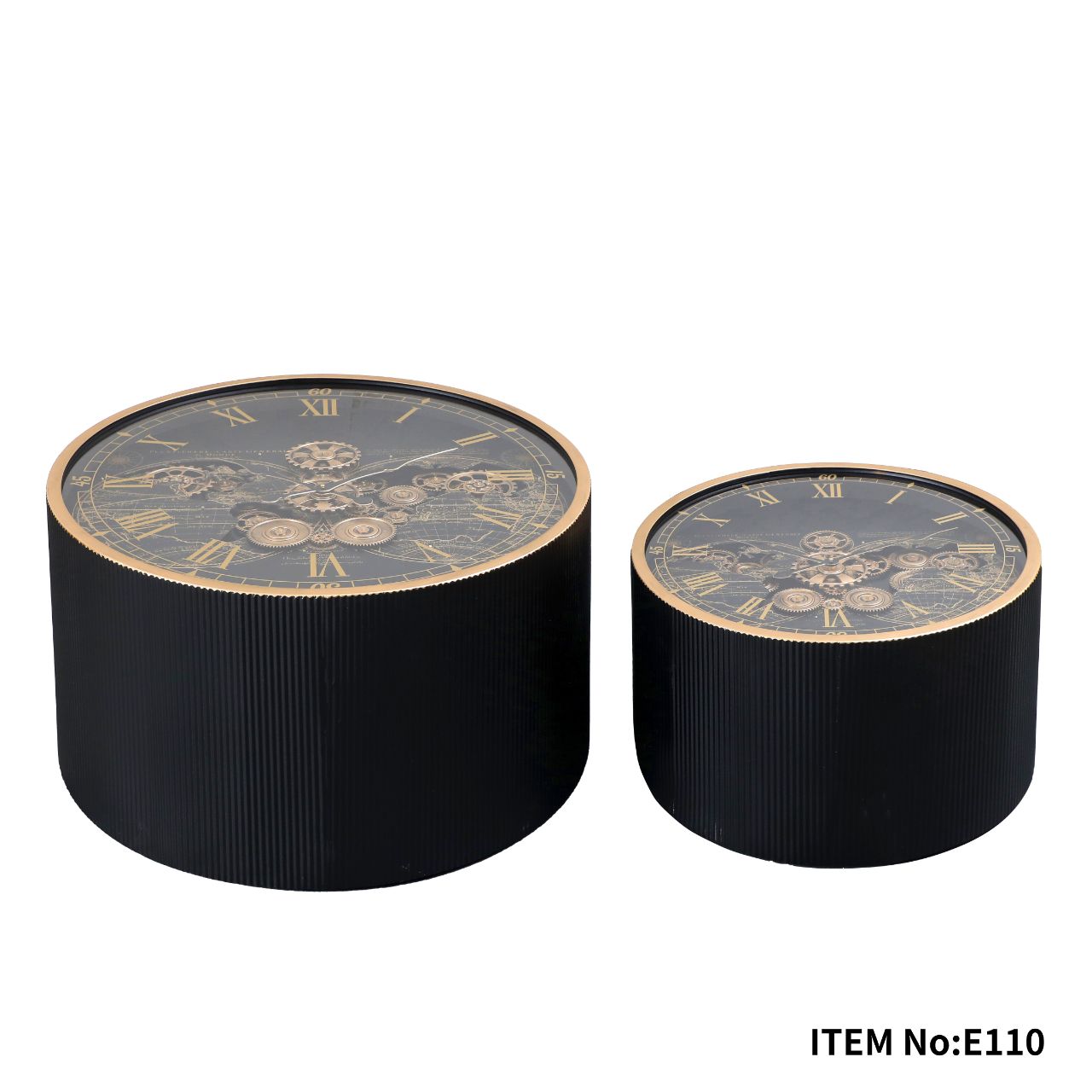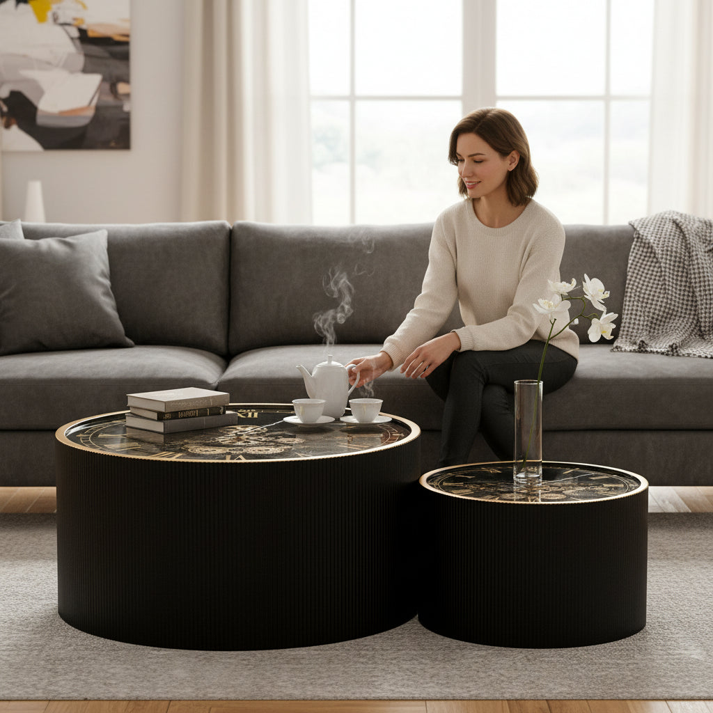 Elevate your living space with the "Vintage Timekeeper" Steampunk Nesting Table. This unique duo features two tables of different sizes, each topped with a stunning glass surface that reveals a golden clock face with intricate, exposed gears. The bold Roman numerals, vintage-inspired backdrop, and sleek black ribbed frame combine to create a perfect fusion of industrial-chic and classic elegance. This set is a captivating and functional centerpiece for any room.