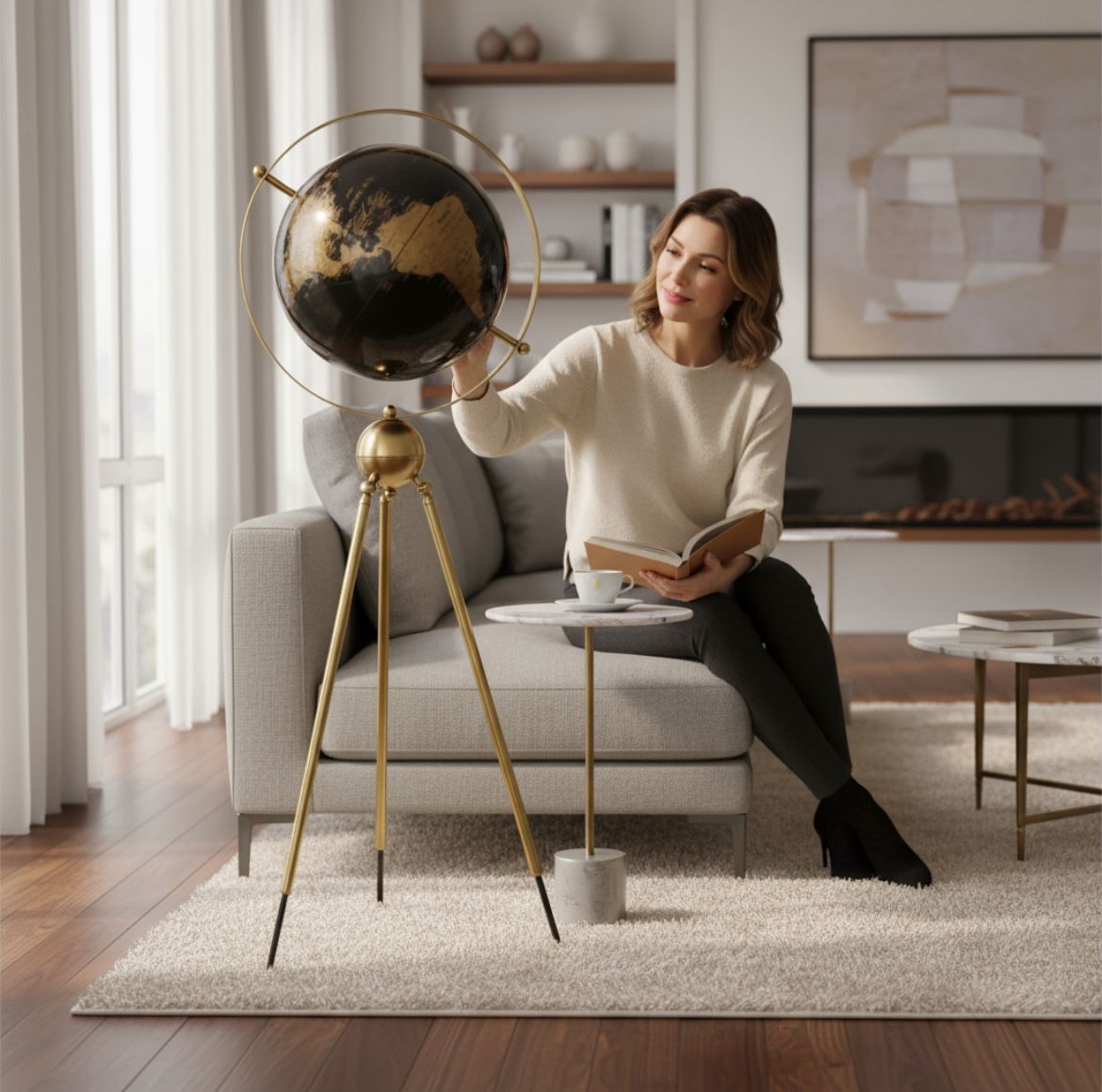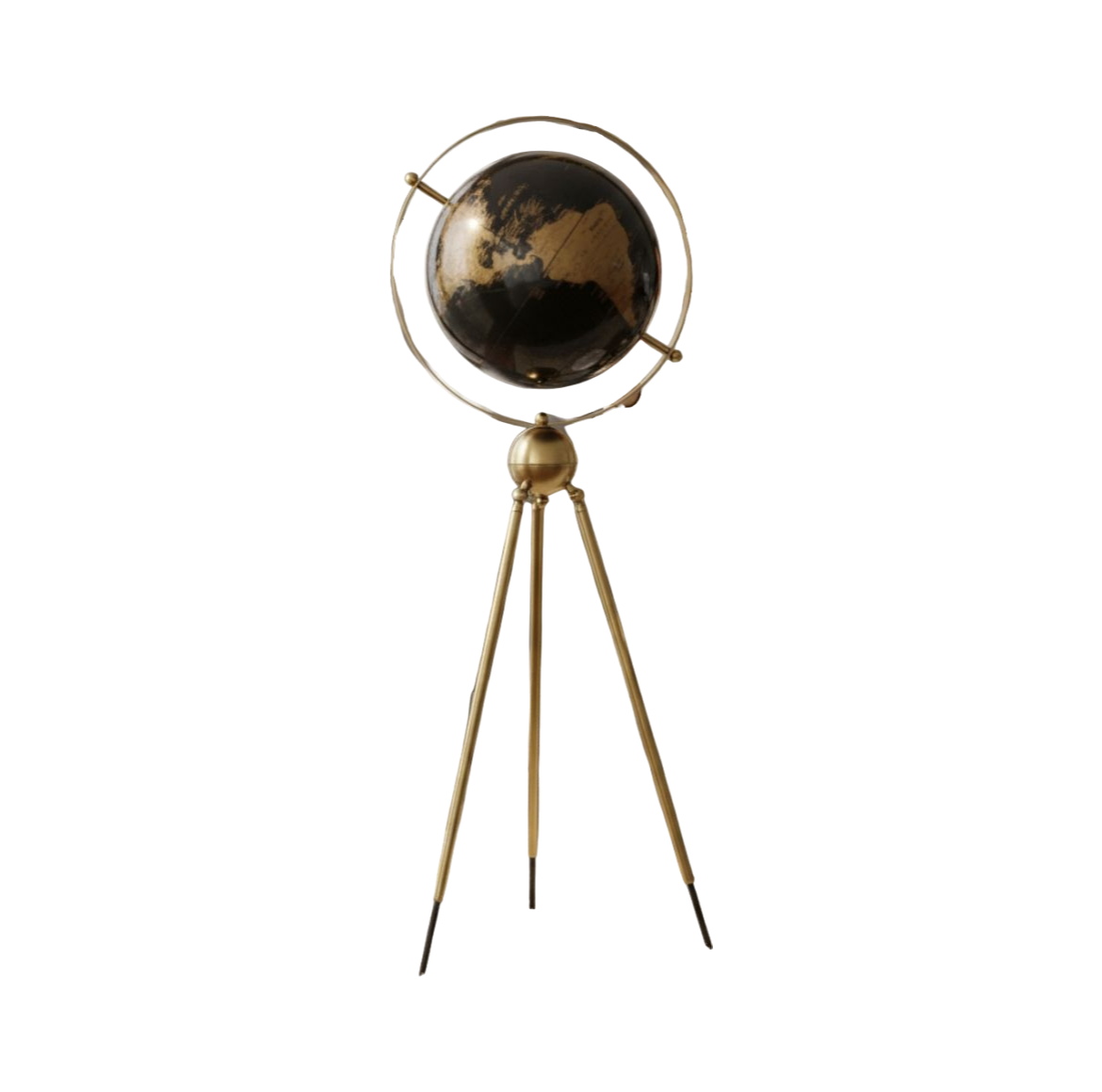 A striking blend of vintage charm and modern elegance, the Midnight Brass Globe on Tripod Stand is designed to captivate. Featuring a deep black globe with antique-style cartographic detailing, it rests securely on a sleek, golden brass tripod base. Ideal for study rooms, living spaces, or office interiors, this decorative floor piece adds a touch of world-class sophistication and timeless style to any setting.