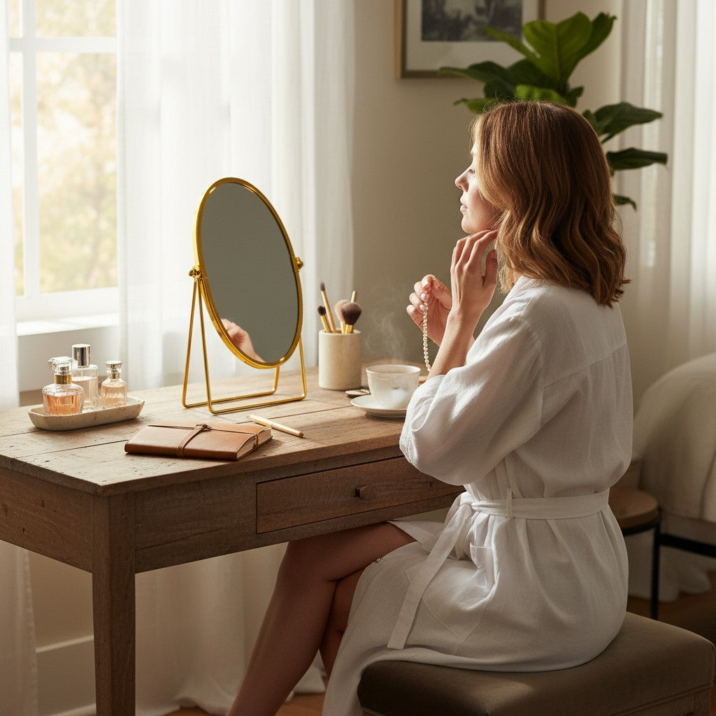 Bring a touch of timeless elegance to your space with the Aurelia Golden Glow Table Mirror. Crafted with a sleek metallic gold frame and a minimalist stand, this mirror perfectly blends sophistication and practicality. Its tilting design allows easy adjustment for makeup, grooming, or decor styling. Ideal for dressing tables, vanities, or modern workspaces, it adds a subtle hint of luxury to any corner.