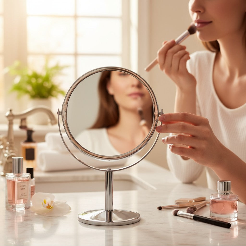 Bold yet minimal, the Nova Chrome Edge Mirror stands out with its radiant silver tone and sturdy metallic frame. Designed for modern interiors, it adds a sleek, reflective accent to your table or vanity. A perfect blend of simplicity and shine, it’s where everyday reflection meets effortless style.