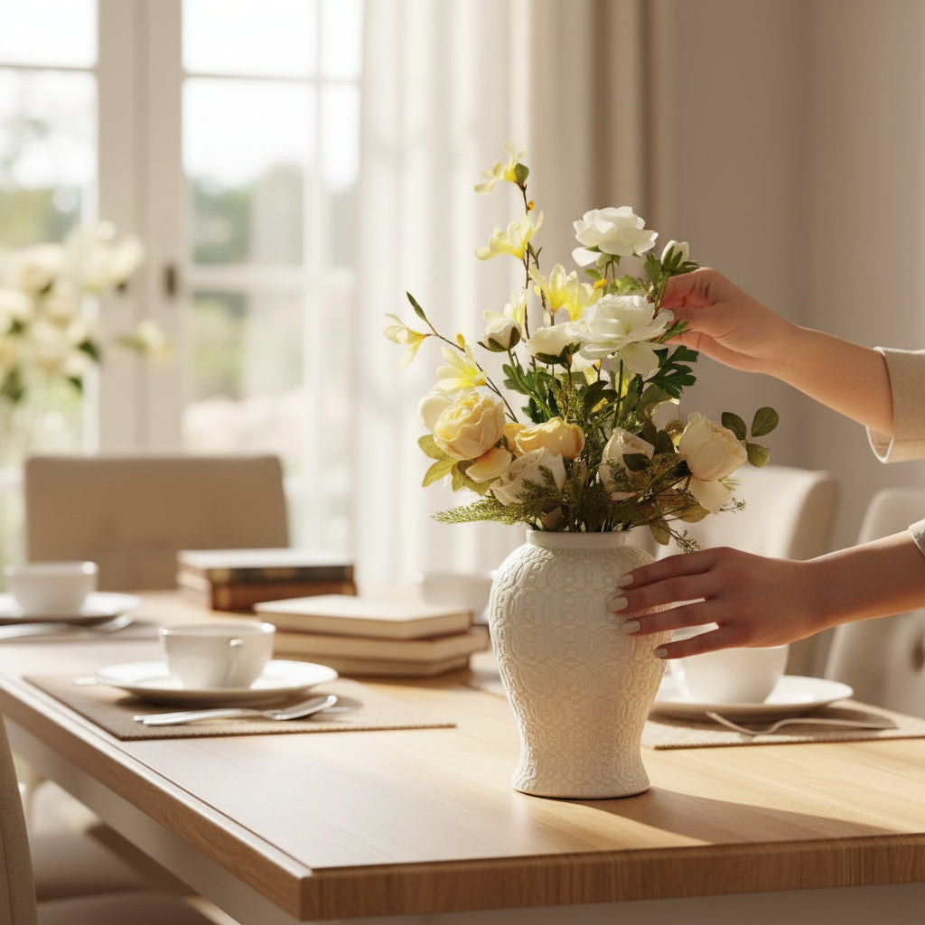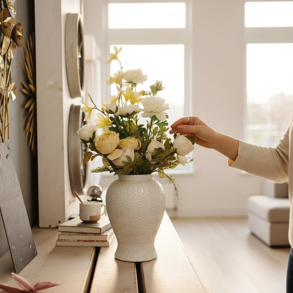 This modern ceramic vase is beautifully enhanced with a premium floral arrangement that adds instant elegance and visual appeal to any space. Crafted from high-quality ceramic, the vase features a smooth, contemporary finish, while the carefully designed arrangement creates a natural, balanced, and sophisticated look.