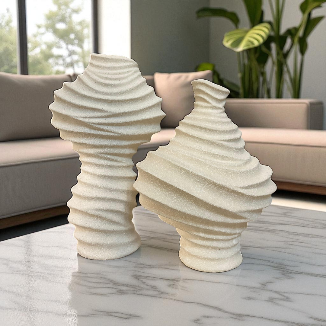 A modern ceramic vase featuring a rippled, wave-like surface design that creates a striking sculptural effect. The matte ivory finish enhances its artistic form, making it a versatile décor piece for contemporary spaces. Perfect as a standalone statement or for displaying dried florals.
