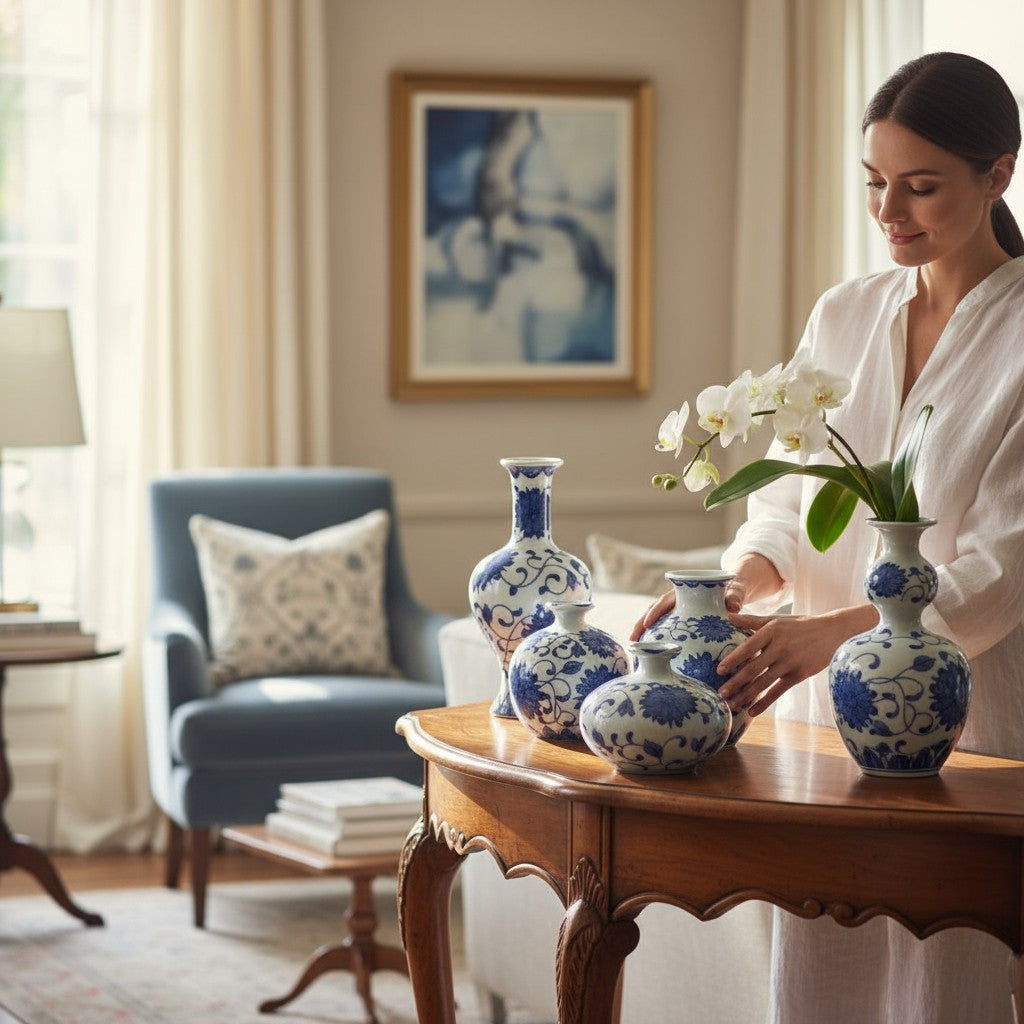Infuse your décor with classic charm using the Azure Bloom Ceramic Pottery Set. This exquisite 5-piece collection showcases intricate blue floral patterns on fine white ceramic, inspired by timeless artisanal craftsmanship. Perfect for display on shelves, consoles, or tabletops, each piece adds a touch of elegance and cultural beauty to any setting. Whether styled together or separately, this set brings a refined and serene aesthetic to your home.