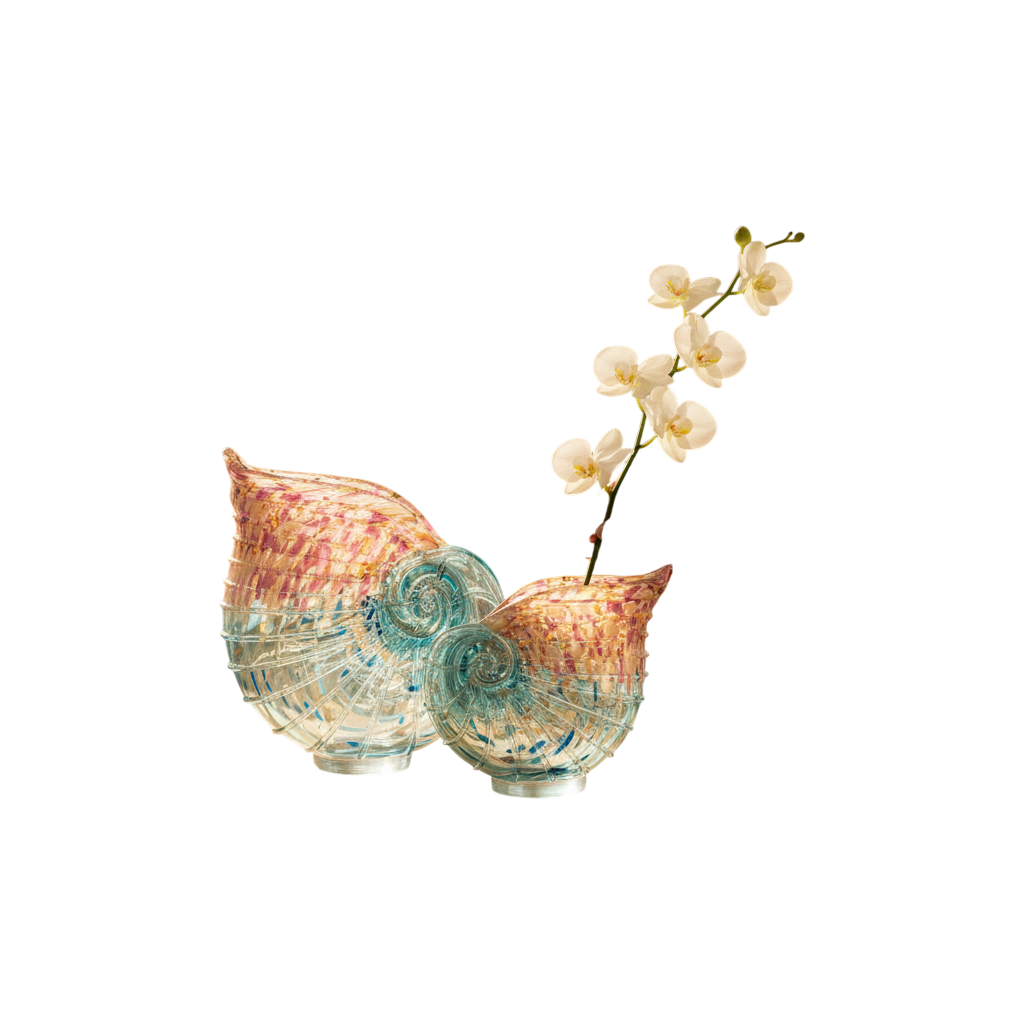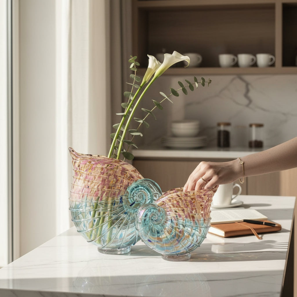 The Luminous Depths of Azure vase is a celebration of light, form, and craftsmanship. Its vertically fluted surface enhances the clarity of the glass, allowing light to travel effortlessly through its soft blue body. The result is a subtle glow that shifts throughout the day, transforming the vase into a living element of the space.