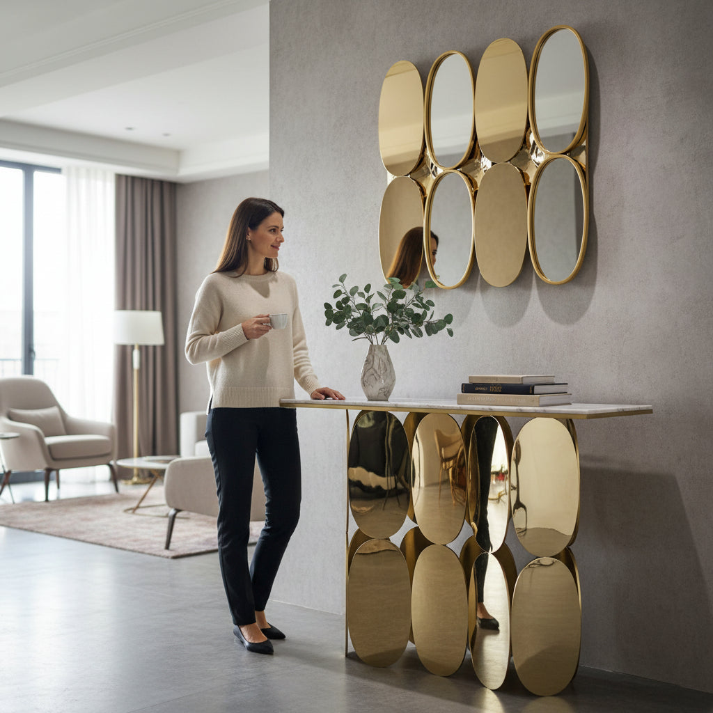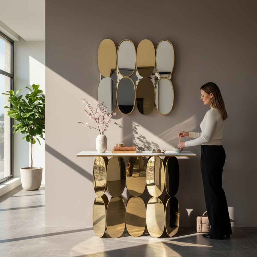 Perfect for entryways, hallways, living rooms, or behind sofas, this console table serves as both a decorative statement piece and a practical surface for everyday use. The strong stainless steel frame ensures stability and durability, while the modern design blends seamlessly with luxury and contemporary interiors.
